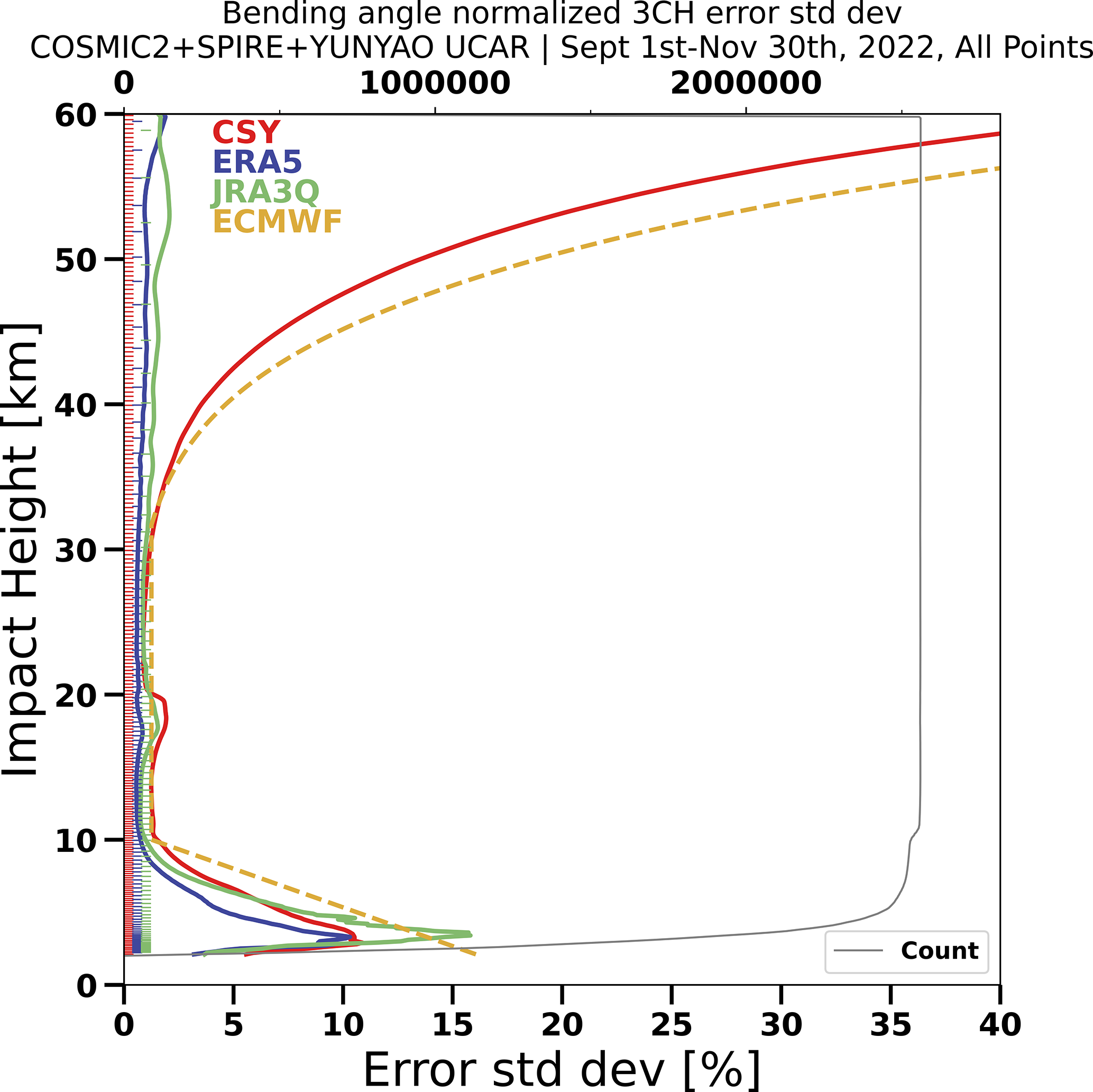 Figure 113CH BA uncertainties of the CSY data. Also shown are the uncertainties of the two other corners of the 3CH method, ERA5 (blue) and JRA-3Q (green). The orange dashed curve, identified by ECMWF in the figure, is the ECMWF assumed RO observation error model (Ruston and Healy, 2020). The data counts are given in gray.
