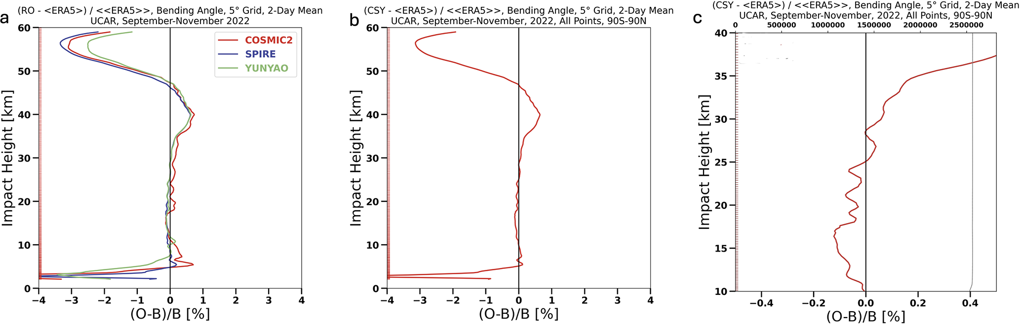 Table 1 in A2024 shows the average number of RO profiles d−1 from the 13 different missions. Of the total average number of 34 520 profiles d−1, 78.4 % are contributed by three missions: COSMIC-2 (4900), Spire (16 750), and Yunyao (5400). Therefore, in this paper we examine these three missions especially closely, because they are the ones likely to have the most impact on models. Furthermore, they are quite independent missions, representing one government mission (COSMIC-2) and two commercial missions from different countries, Spire (Europe and the US) and Yunyao (China). The satellites, orbits, instruments, and initial processing of these raw data are all different and independent. For brevity, we call this combined dataset CSY. Of the three datasets, C2 and Spire are relatively well known and have been widely studied (e.g. Schreiner et al., 2020; Bowler, 2020), while Yunyao is a relatively new mission and has been under evaluation only recently. Cheng Yan (Yunyao Aerospace Technology Corp.) presented an introduction to the Yunyao mission and data at the 1st ROMEX workshop held at EUMETSAT in Darmstadt, Germany 17–19 April 2024 (Cheng et al., 2024). Preliminary results presented at the workshop indicated that the quality of Yunyao data after quality control (QC) was similar to that of other missions with some exceptions that were related to their suboptimal data processing and have since been corrected (Xu et al., 2025; Cheng 2025). A second Chinese commercial RO mission, Tianmu, was just getting started in 2022 and provided approximately 270 profiles d−1 for ROMEX. Almost a year later, at the 2nd ROMEX workshop at EUMETSAT 25–27 February 2025, both Yunyao and Tianmu presented results from greatly enhanced constellations, which were providing at that time 30 000 profiles d−1 from Tianmu (Tang, 2025) and 33 000 profiles d−1 from Yunyao (Cheng, 2025). All presentations from the 1st and 2nd ROMEX workshops are available at http://irowg.org/romex-events-meetings/ (last access: 22 November 2025).