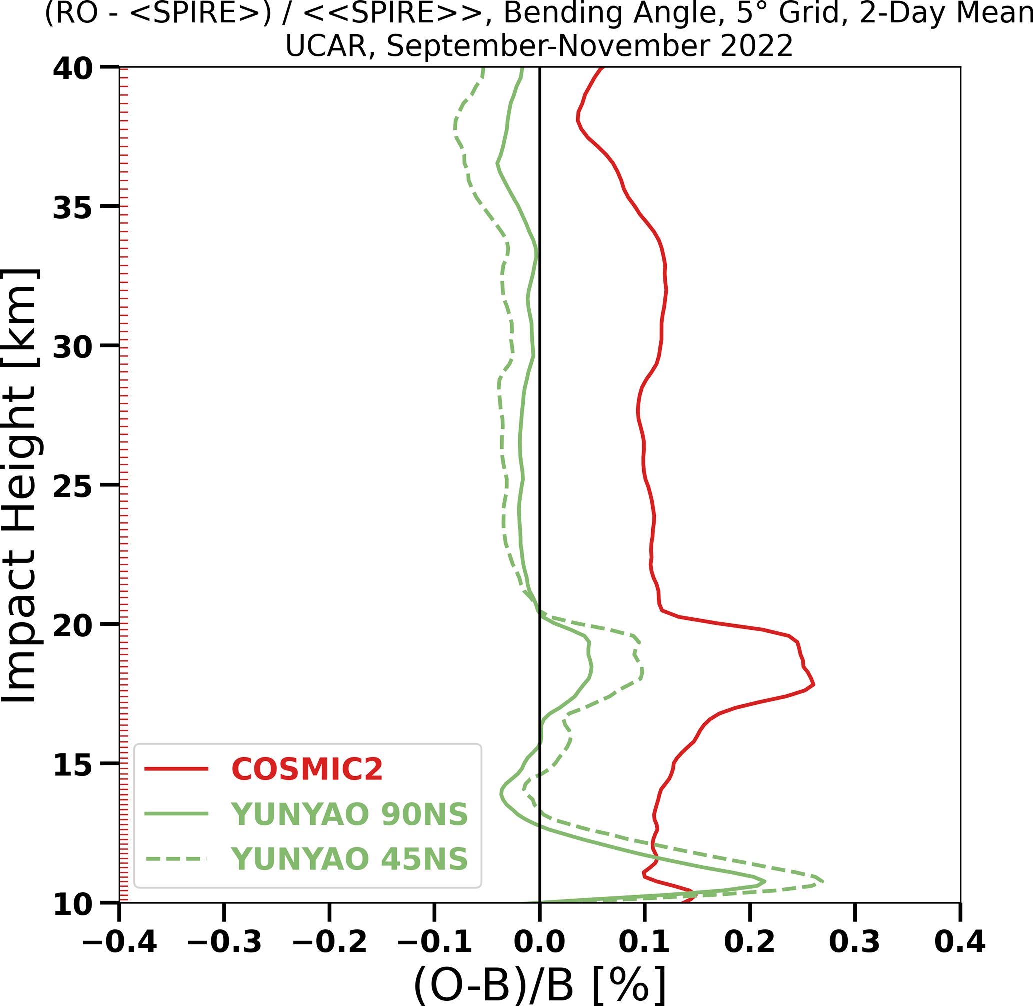 The small negative impact of the ROMEX data on the biases of several NWP models has caused intensive study of possible causes of these biases, including the possibility of biases in the ROMEX data (discussed in the two ROMEX workshops https://irowg.org/romex-1/, last access: 22 November 2025 and https://irowg.org/romex-2/, last access: 22 November 2025). Indeed, it appears that most ROMEX data may have a small negative bias of approximately −0.15 % between 10 and 30 km. Figure 10a shows this bias with respect to ECMWF analyses, while Neill Bowler (personal communication 22 May 2024), Syndergaard and Lauritsen (2024), and Ho et al. (2024) found similar negative biases. This section takes a close look at the biases of C2, Spire, and Yunyao, which appear to be between ±0.15 % between 10–30 km (Fig. 10b).