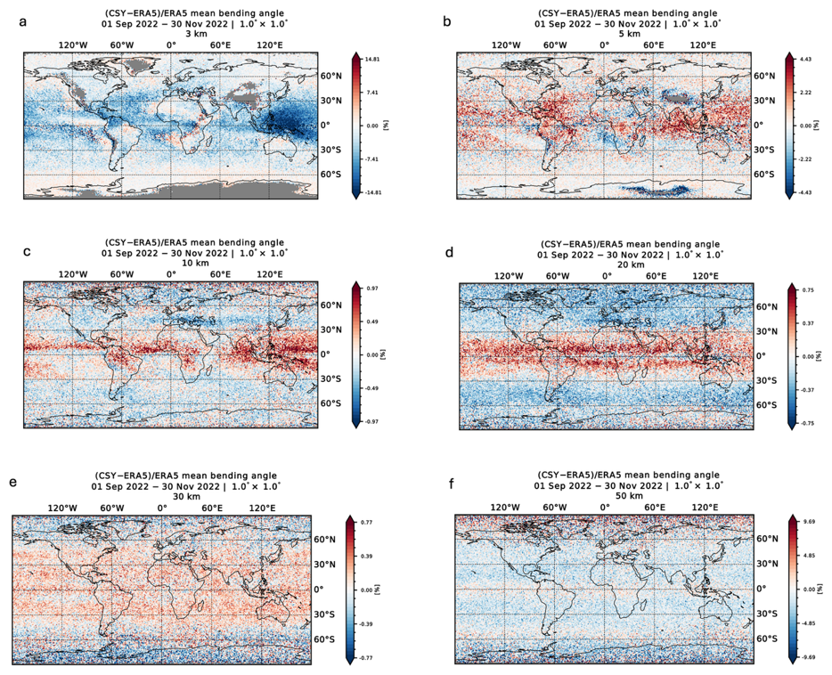 The geographic distribution of the CSY BA biases relative to ERA5 at six levels is shown in Fig. 16. Larger versions of these figures and the corresponding CSY N biases are given in the Supplement. We note that the N biases above 40 km are affected by the statistical optimization, which can vary with different processing centers. These are computed from 1° latitude-longitude bins. Similar to the uncertainties (Fig. 13), the largest biases at 5, 10, and 20 km are located in the tropics. Regions of large biases at 5 km occur over the western Atlantic and South America, the western Pacific, Asia, and Indian Ocean, perhaps associated with regions of strong moist convection. Bands of negative or near-zero biases exist off the west coasts of South America and Africa at 5 km. At 30 km, biases are small. ERA5 biases may be of comparable or larger magnitude at all levels.