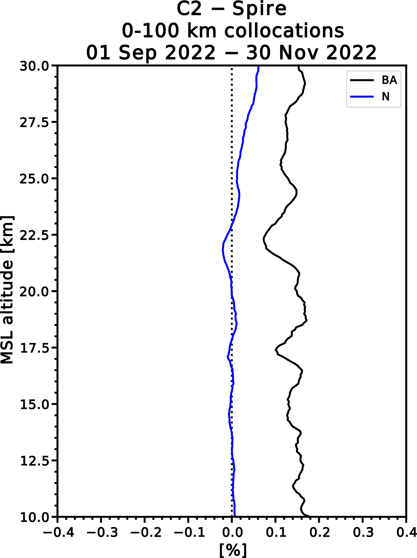 In addition to the results shown here, several other, independent studies have indicated that C2 BA observations have a small positive bias between approximately 10 and 30 km compared to models and other RO data from polar-orbiting satellites. For example, a EUMETSAT report evaluating Sentinel-6 data showed a C2 positive bias of ∼ 0.2 % (EUMETSAT 2022, Fig. 33). Positive biases of C2 BA and N vs. ERA5 and other RO missions in the lower stratosphere have also been reported by Ho et al. (2024, 2025). The ROM SAF Matched Occultation page presents daily estimates of the biases of RO satellites compared to other RO satellites, with a collocation criteria of 300 km and 3 h (https://rom-saf.eumetsat.int/monitoring/matched.php, last access: 22 November 2025). A comparison of C2 satellites with other satellites (e.g. Metop-B) shows a slight positive bias (about 0.1 %–0.2 %) between about 10 and 30 km. Above 40 km and below 8 km the mean differences are larger, exceeding several percent; these will not be discussed further as they are in layers that currently have small impact in NWP models. In this section we investigate the bias between 10 and 30 km in greater detail. For this discussion, we use Spire as an example of polar orbiting satellites – given its large data volume within ROMEX – to explain the observed positive C2 biases relative to other RO missions.