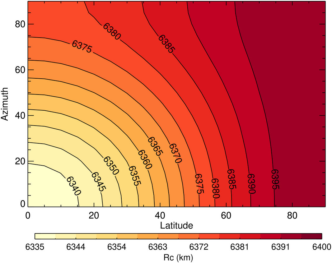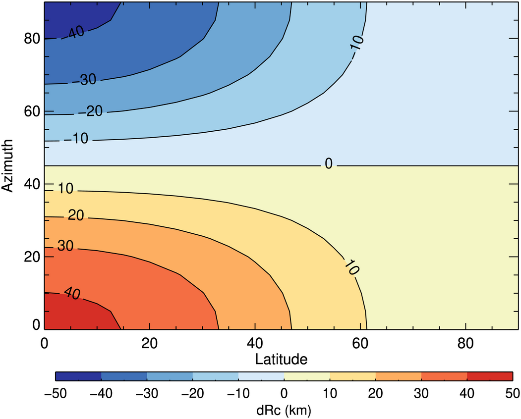 Figure 20Variation of Rc with latitude (x-axis) and azimuth angle of occultation plane (y-axis). Note that Rc increases with latitude and the variation of Rc is larger at low latitudes compared to high latitudes.