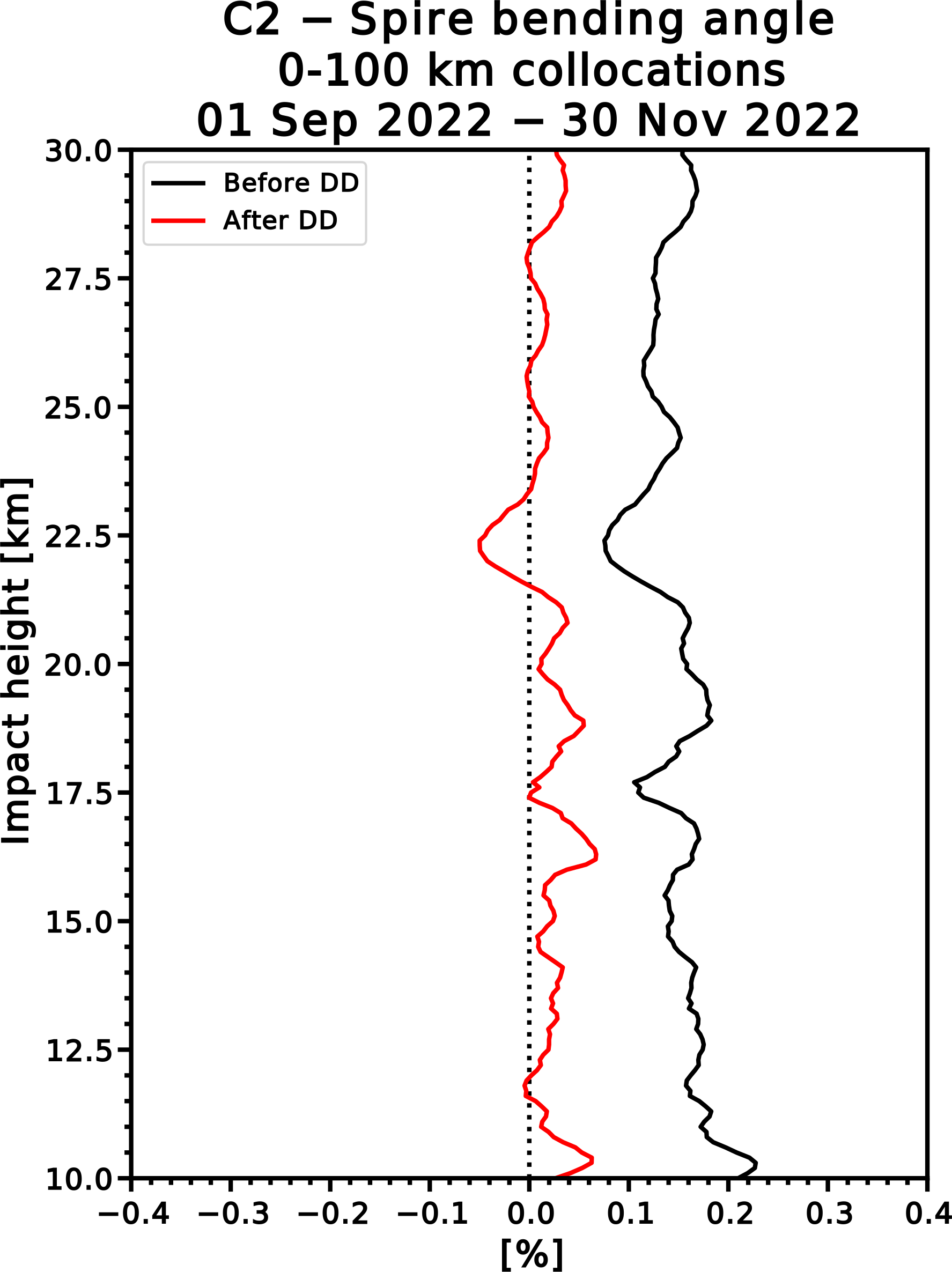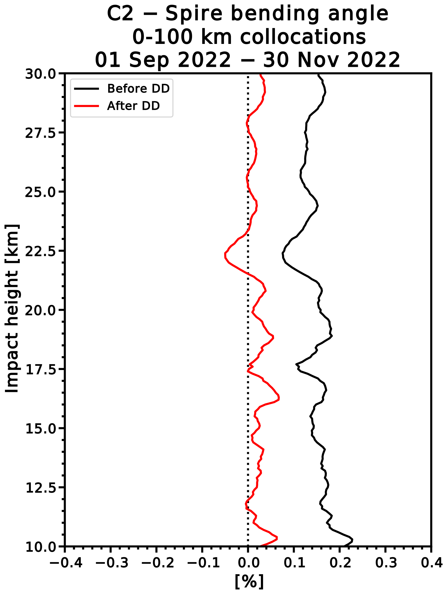 DD accounts for differences in the two data sets associated with other sampling differences such as temporal and spatial location differences, as well as those due to different azimuth angles and Rc. Figure 21 shows that DD using ERA5 reduces the C2-Spire BA biases to an average of about 0.02 % between 10 and 30 km impact height.