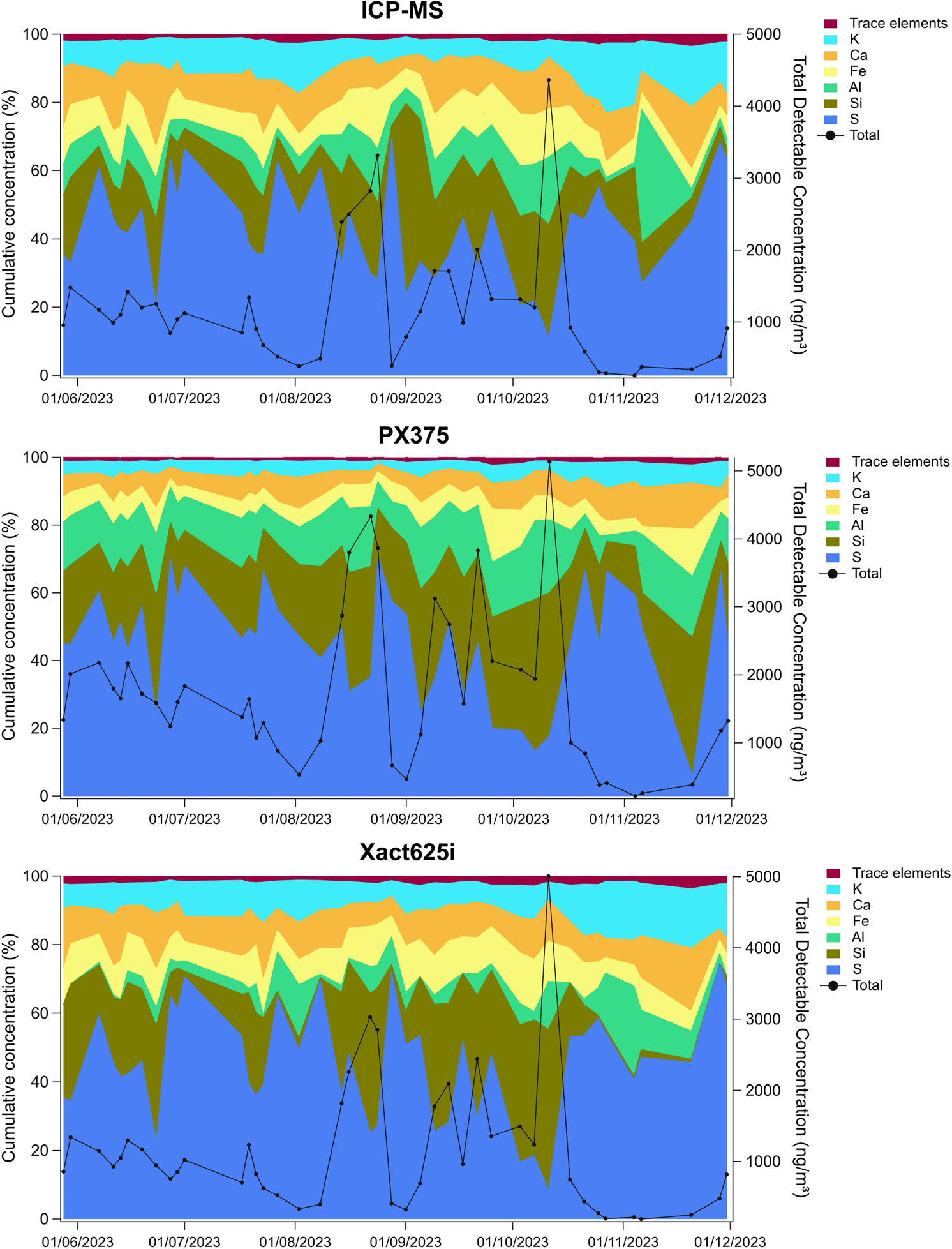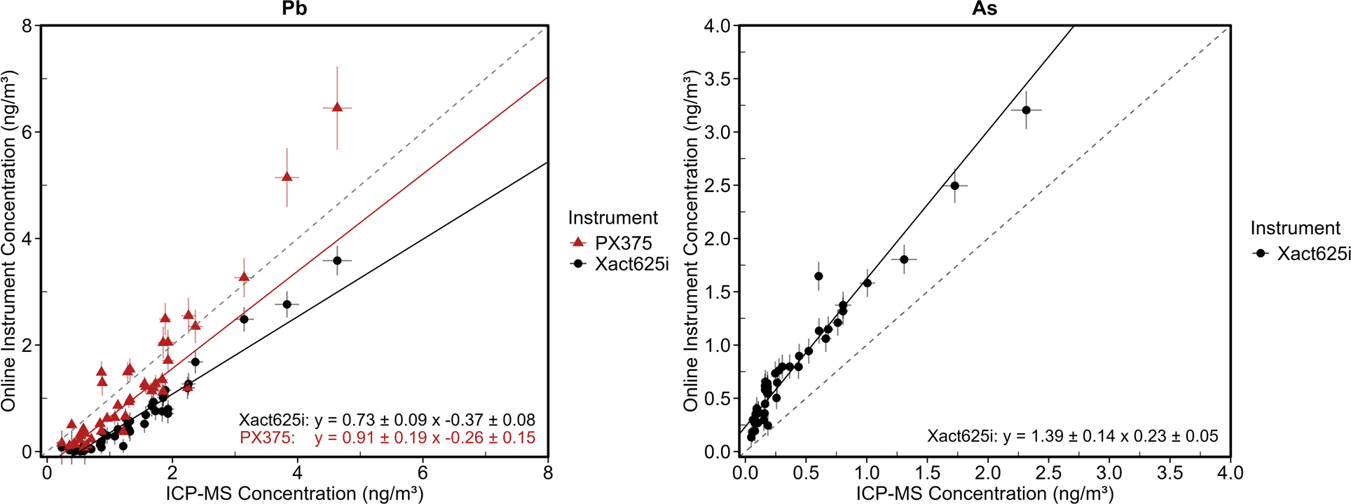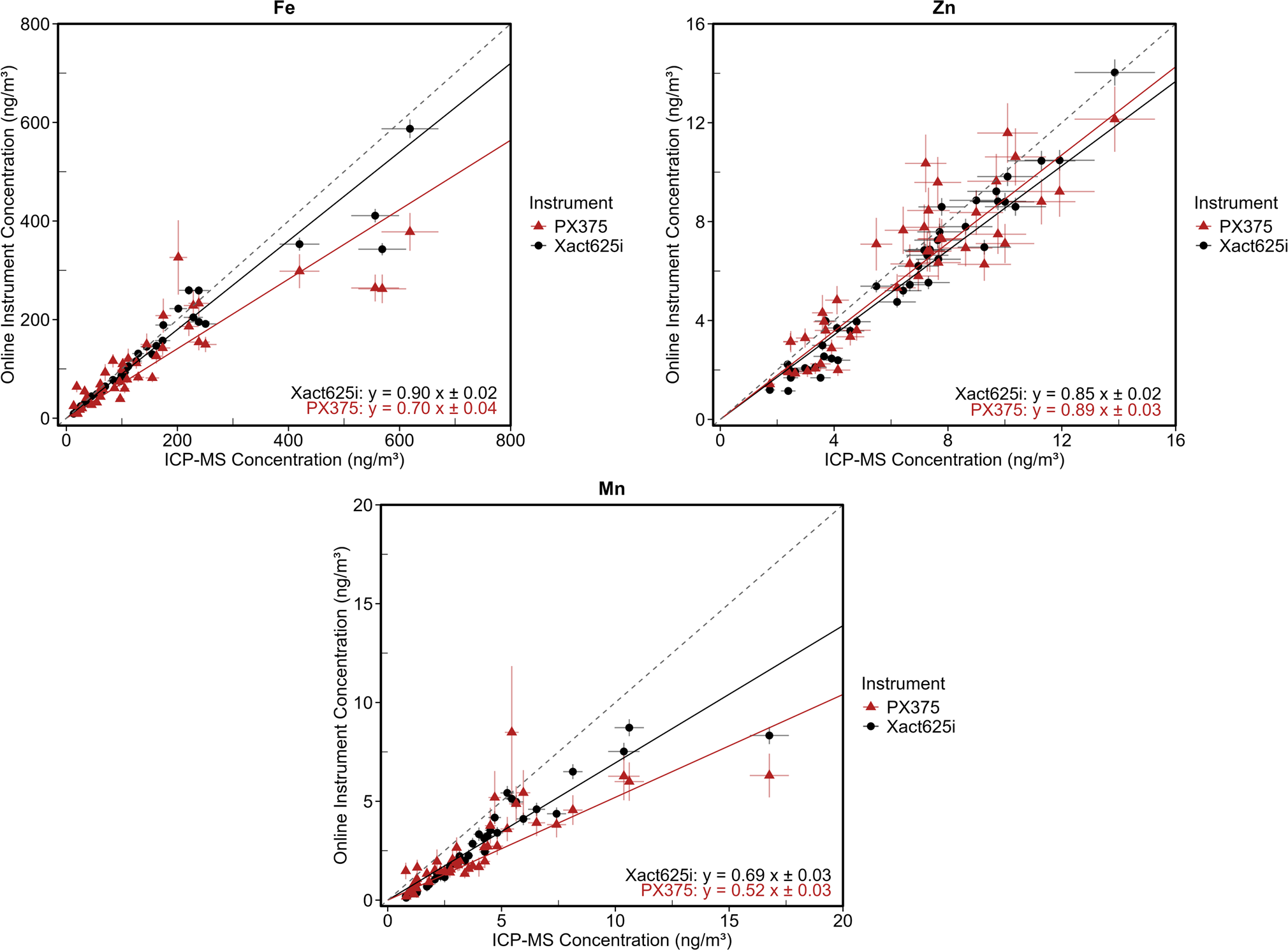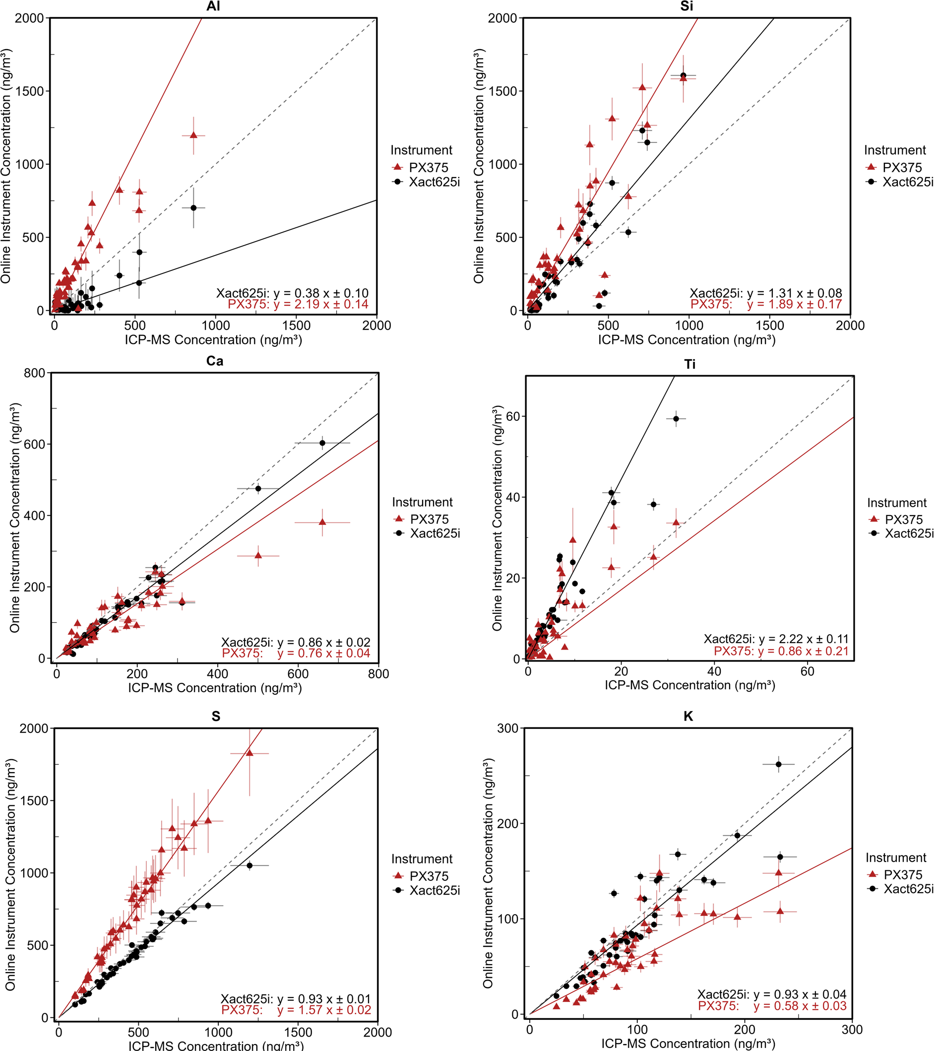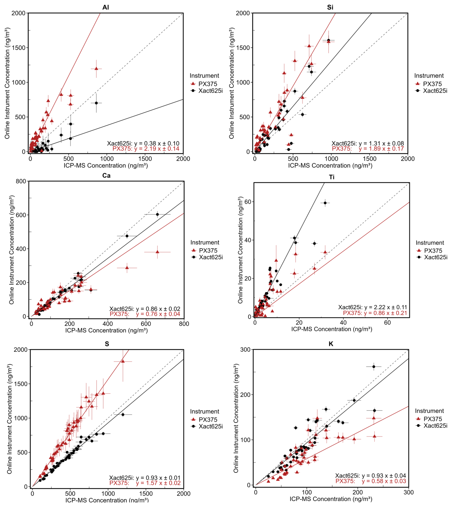 Direct comparisons of ED-XRF vs. ED-XRF using 2 h data showed strong internal consistency (R2=0.95), higher than PX-375 vs. ICP-MS (0.78) and Xact625i vs. ICP-MS (0.89) indicating that lower correlations in ICP-MS comparisons were at least partly due to daily averaging rather than measurement inconsistencies. However, regression slopes largely aligned with ICP-MS trends, validating elemental over- and underestimation patterns for both instruments.