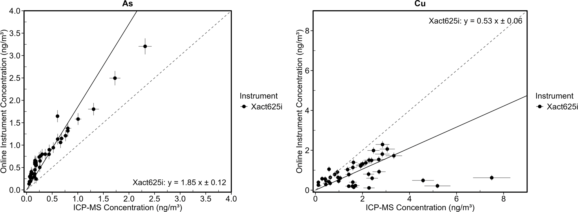Two elements, As and Cu, were most of the time undetected by the PX-375 due to concentrations being below instrumental LoD. The shorter analysis time for the PX-375 (500 s) may explain the inability of the instrument to measure these elements. Line interference is well-known for the couple Pb–As, and the higher concentration of Pb observed in the samples during the campaign can also make detection of As difficult for PX-375 (Furger et al., 2017). The Xact625i measured As with a high r2 value of 0.95 but coupled with high overestimation (Fig. 7), with indications of nonlinearity to be examined further below. Ten outliers were observed for Cu, skewing r2 to 0.07 from a potential 0.76 when removed; due to the absence of PX-375 Cu data, the source disagreement for these data points cannot be determined.