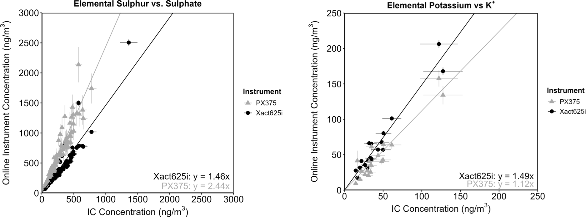 While the regression slopes from the IC analysis indicated similar findings to the comparison of ED-XRF and ICP-MS, i.e., higher S concentrations found by the PX-375 and lower for the Xact625i and vice versa for K, inconsistencies may be due to organic S not measured by IC, sources of insoluble K, and the offline sampling being done in PM1 compared to PM10 (although soluble S and K are known to be mostly found <1 µm in diameter, Huang et al., 2016; Zhang et al., 2012).