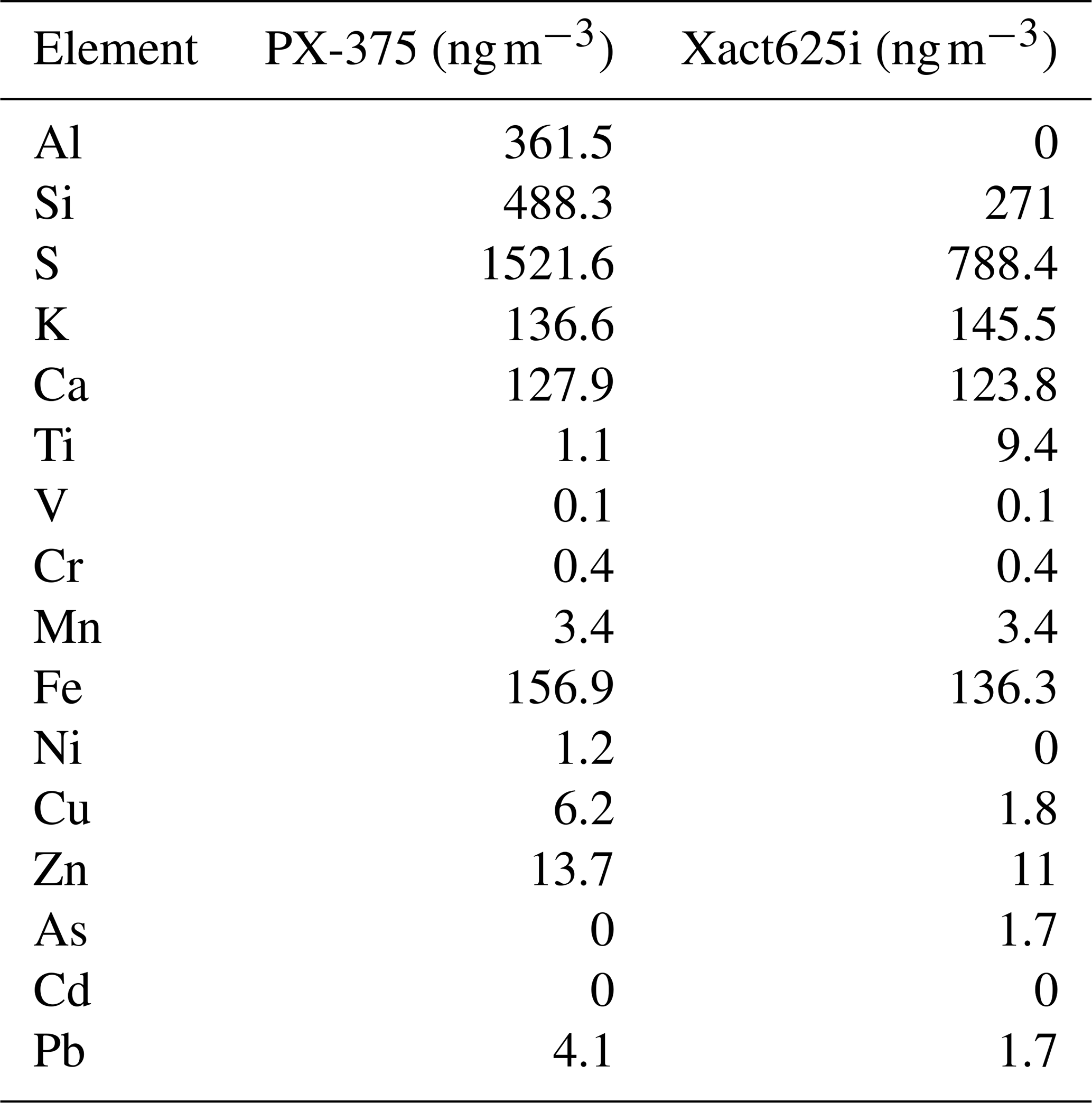PM10 measured by the station's reference method showed values over the 43 samples ranging from 4.5 to 22.8 µg m−3. For the 43 daily averaged samples, total elemental concentrations for the PX-375 and Xact625i were 1772 and 1182 ng m−3 respectively, compared to 1245 ng m−3 for the offline analysis, skewed by overestimation of more abundant elements (e.g., Al and S) by the PX-375. An overview of elemental concentrations is shown in Fig. 3 and in Table S7 in the Supplement.