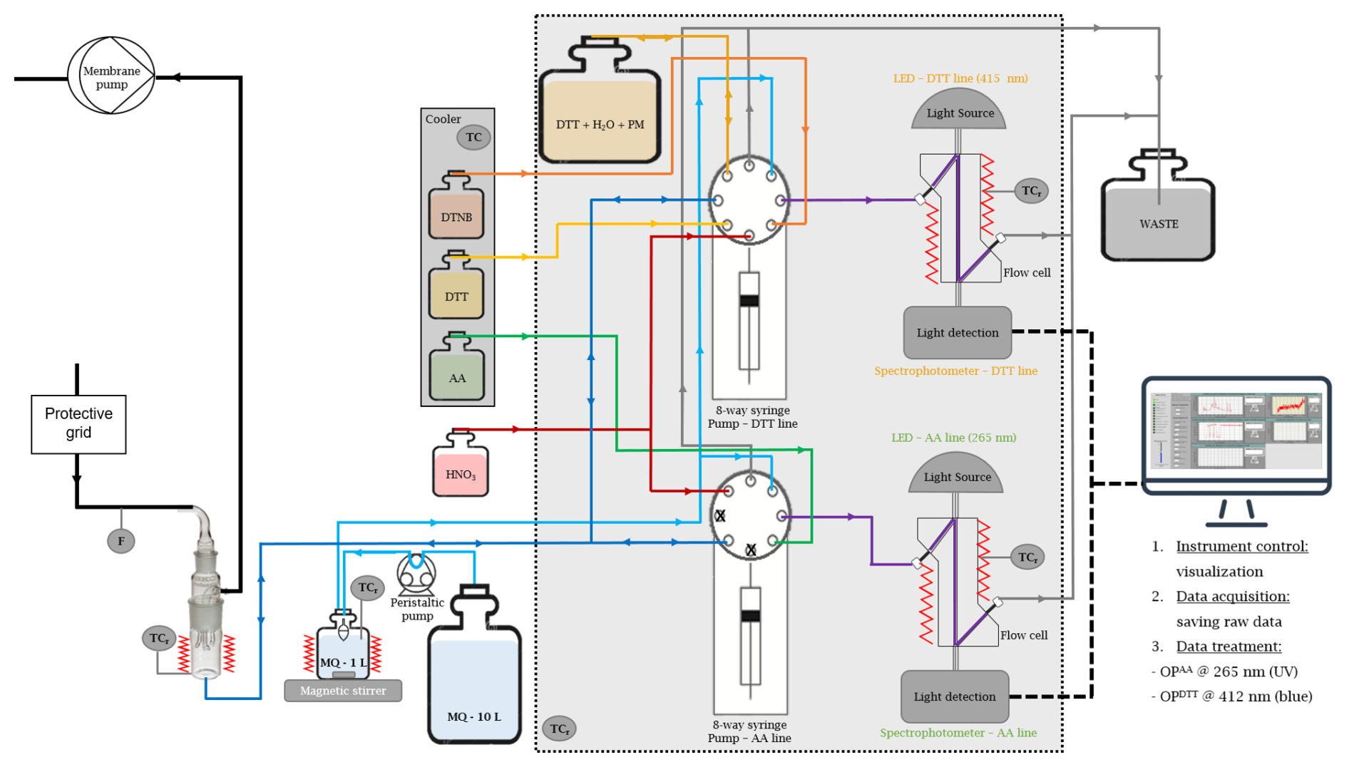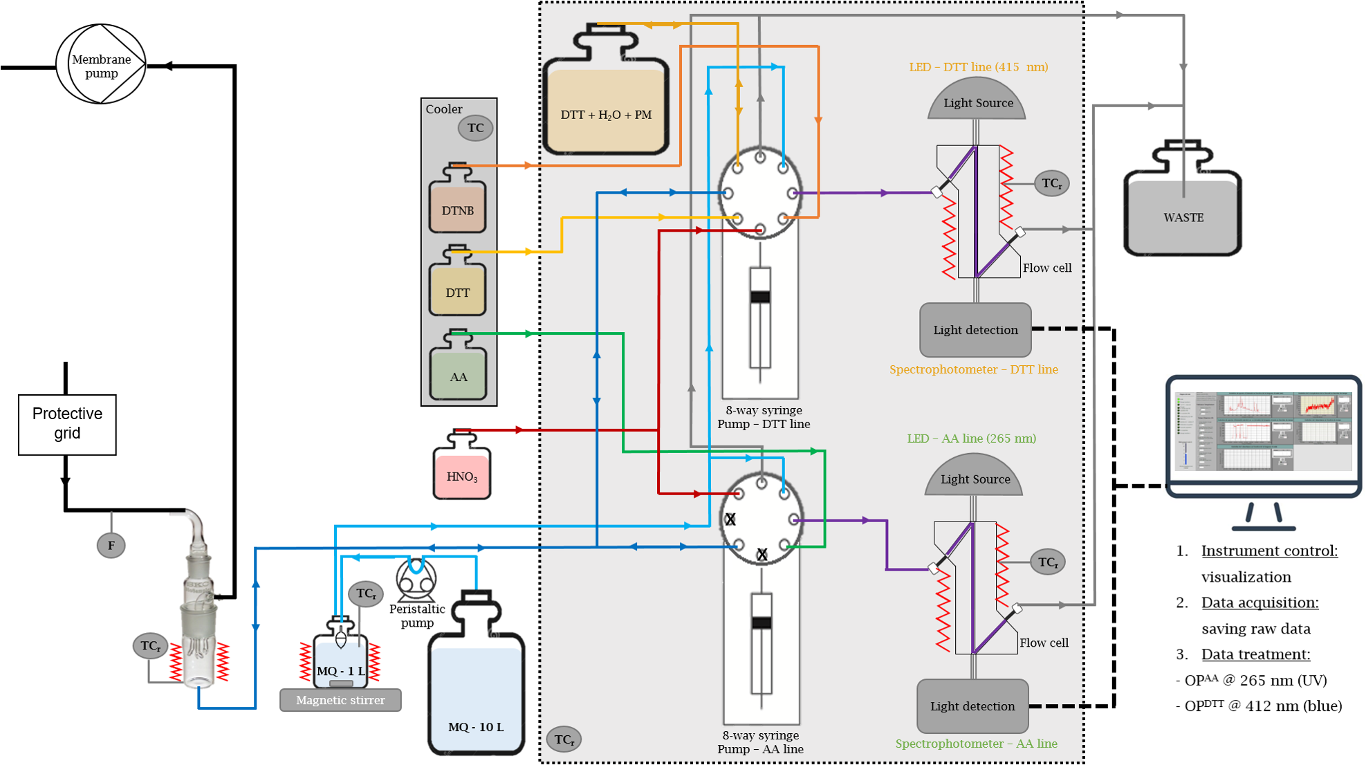 The ROS-Online device, a stand-alone prototype for near-real-time measurement of ambient air OP via two complementary assays, is currently under development at the Institute for Environmental Geosciences (IGE, Grenoble, France). The device integrates two independent measurement lines, allowing the simultaneous measurements of ascorbic acid OP (OPAA) and dithiothreitol OP (OPDTT). Both tests are known for their physiological, practical, and economic advantages, and are widely used in offline methods (Dominutti et al., 2025; Mudway et al., 2004; Perrone et al., 2019; Rao et al., 2020). This device differs from others by assessing both OPAA and OPDTT from a unique atmospheric sample collected through a BioSampler® (SKC) for both soluble gases and particulate matter.