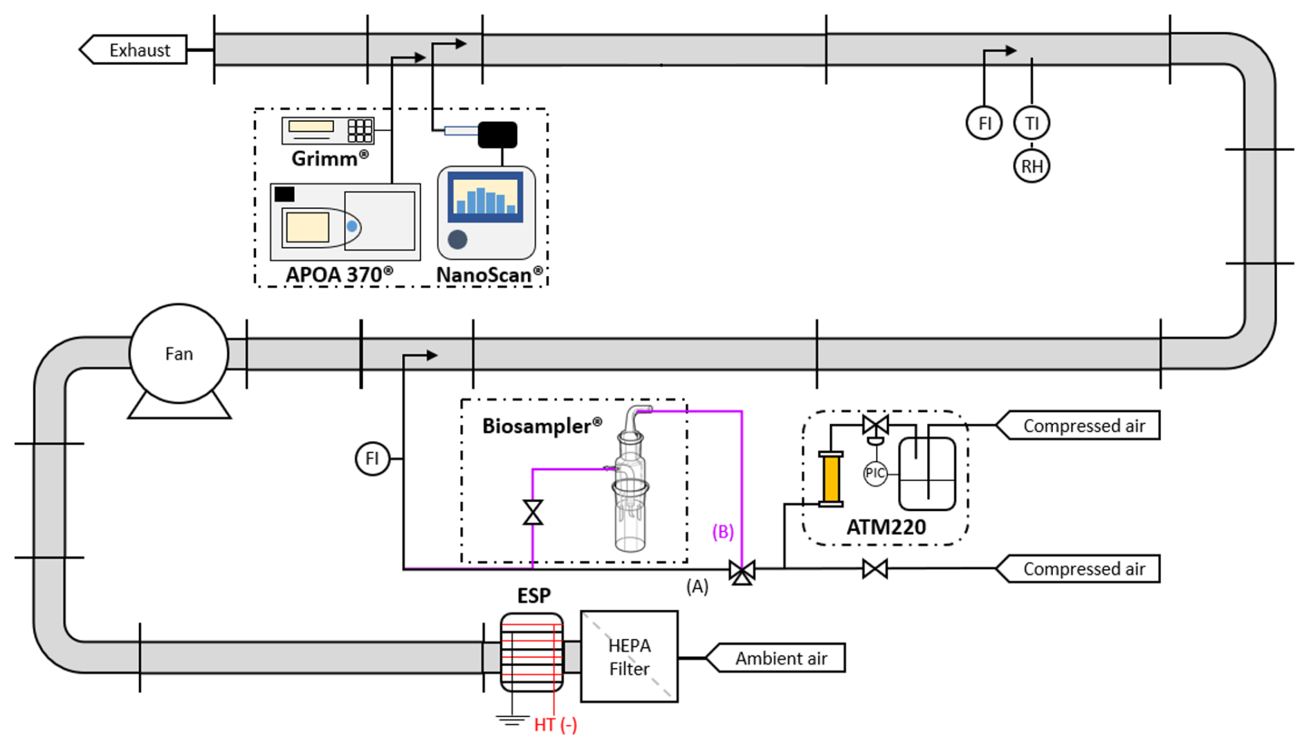 Figure 2Schematic diagram of the experimental bench at LOCIE laboratory: the figure shows the set-up for the BioSampler® collection efficiency experiment.