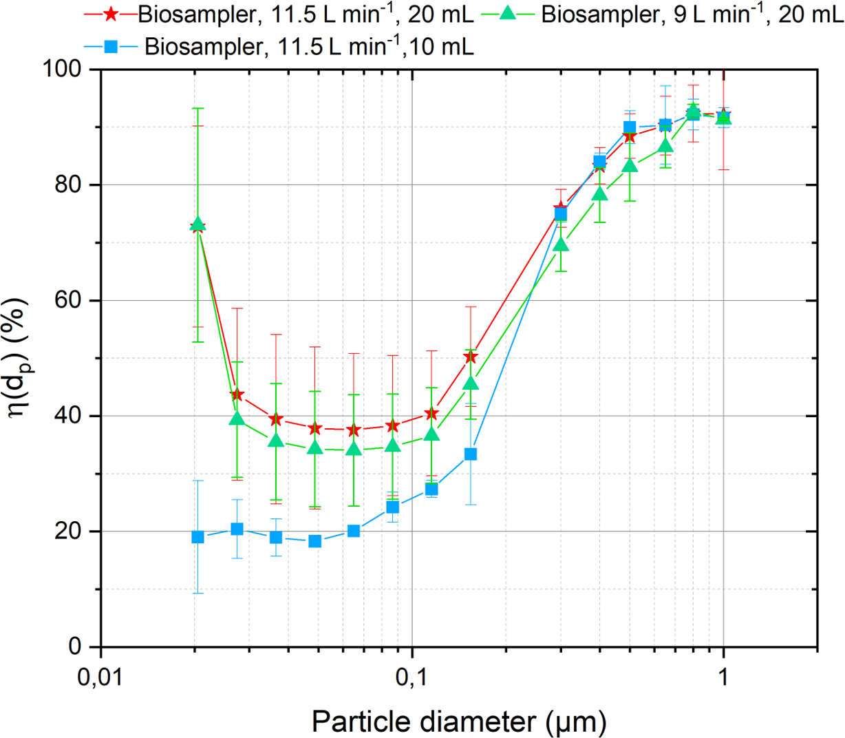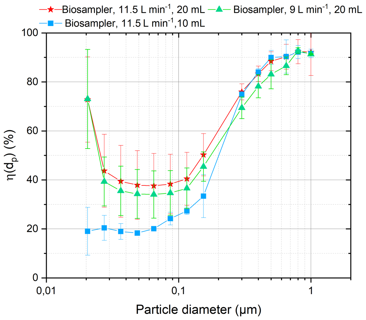 As shown in Fig. 3 for experiments with different sampling volumes, the loss of sampling liquid through evaporation also reduces the collection efficiency, especially for nanometric particles (< 100 nm). This is likely because of a lower aerosolisation of the collection liquid when the distance between the inlet nozzles and the liquid surface increases. These results suggest that the collection efficiency for nanometric particles may significantly decline over prolonged sampling durations, thereby supporting the choice to fill the BioSampler with 20 mL of ultrapure (MQ) water in subsequent measurements.