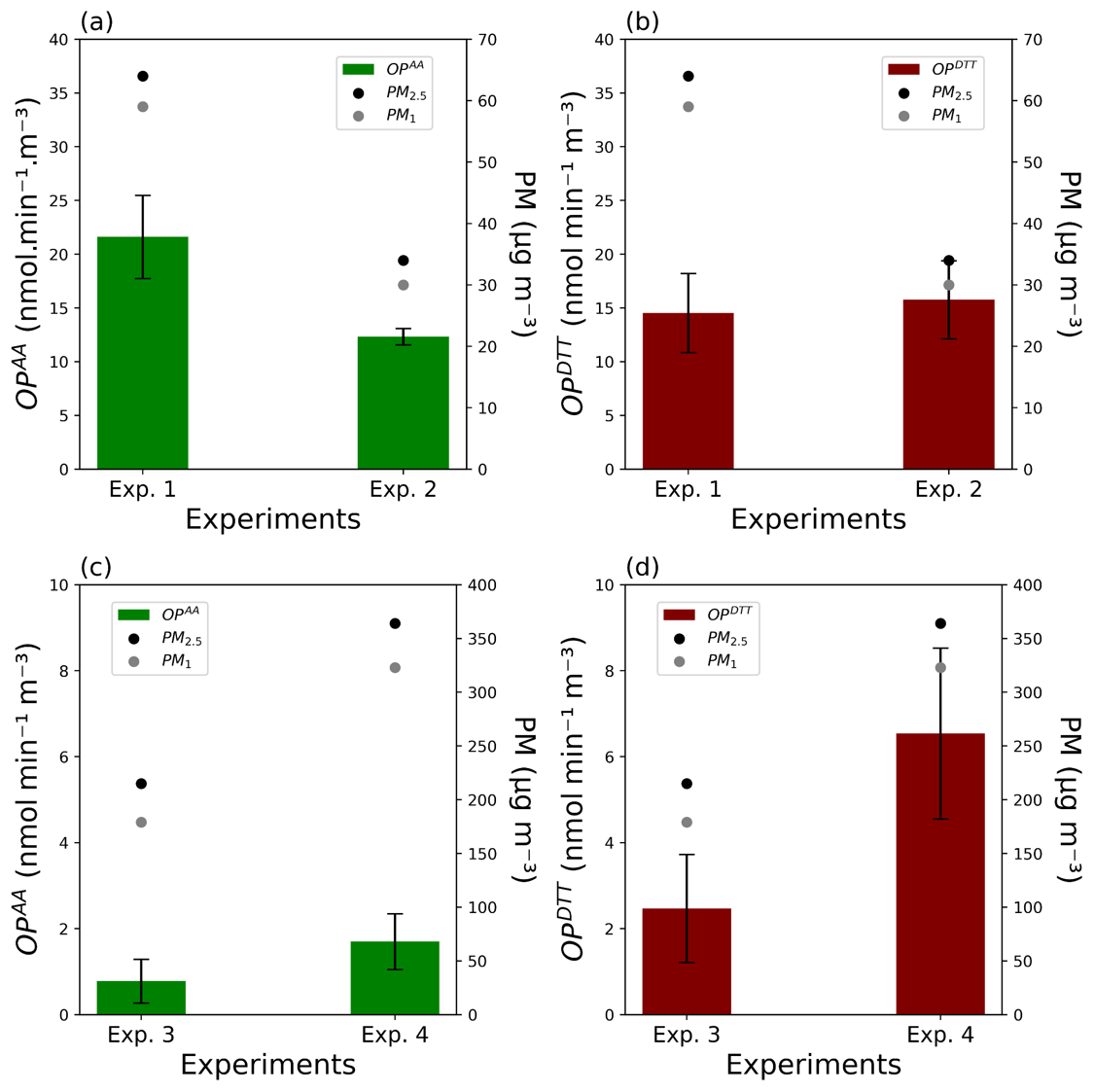Figure 4(a, c) OPAA and (b, d) OPDTT results obtained during the four experiments carried out in the experimental bench. Dots represent the average PM2.5 (black) and PM1 (grey) mass concentrations (µg m−3) in the main flow, bars represent the OP ± 1σ (nmol min−1 m−3) of AA (green) and DTT assays (brown).