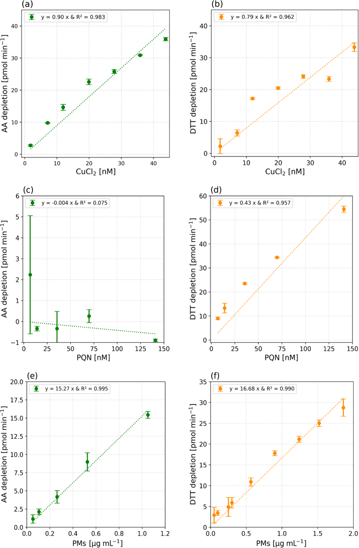 Figure 5Green dots represent the ascorbic acid consumption rate, i.e., depletion, in [pmol min−1] as a function of CuCl2 (a) and PQN (c) concentrations in [nM]. The orange dots represent the dithiothreitol depletion in [pmol min−1] as a function of CuCl2 (b) and PQN (d) concentration in [nM]. (e) Green dots represent the ascorbic acid depletion, in [pmol min−1] as a function of PMs samples [µg mL−1] taken from a traffic site filter (Bern), and (f) orange dots represent the dithiothreitol depletion in [pmol min−1] as a function of PMs samples [µg mL−1] taken from an urban background winter filter (Grenoble). Dashed lines represent the modelled linear regressions. Each sample was analysed in triplicate, and the figures present average (dots), with the error bars representing ± 1σ.