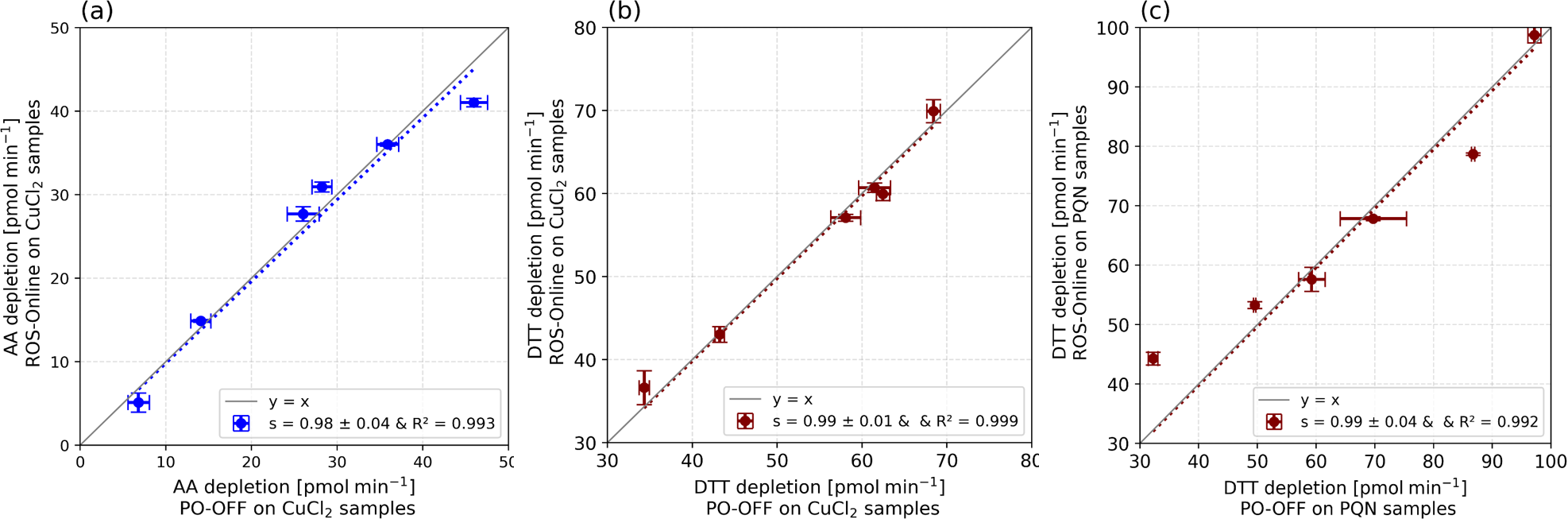 Calibration using CuCl2 and 9,10-phenanthrenequinone (PQN) demonstrated acceptable linearity for environmental applications for both OPAA and OPDTT assays, highlighting its sensitivity to both inorganic and organic classes of atmospheric oxidants. Intercomparison with established offline method confirmed efficiency, with high correlation coefficients (R2 > 0.90) for both assays on a large range of concentrations, which is very encouraging for future deployment of ROS-Online. However, in order to associate offline and online measurements, thorough investigations need to be carried out to determine particle trapping between the two methods, exposure times, intrinsic OP values at different sites subjected to different atmospheres, etc.