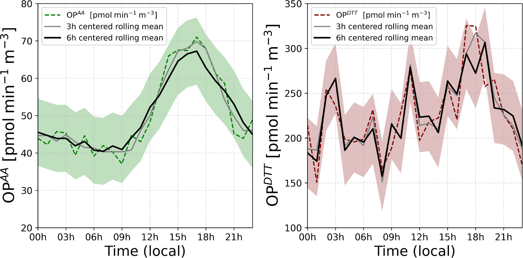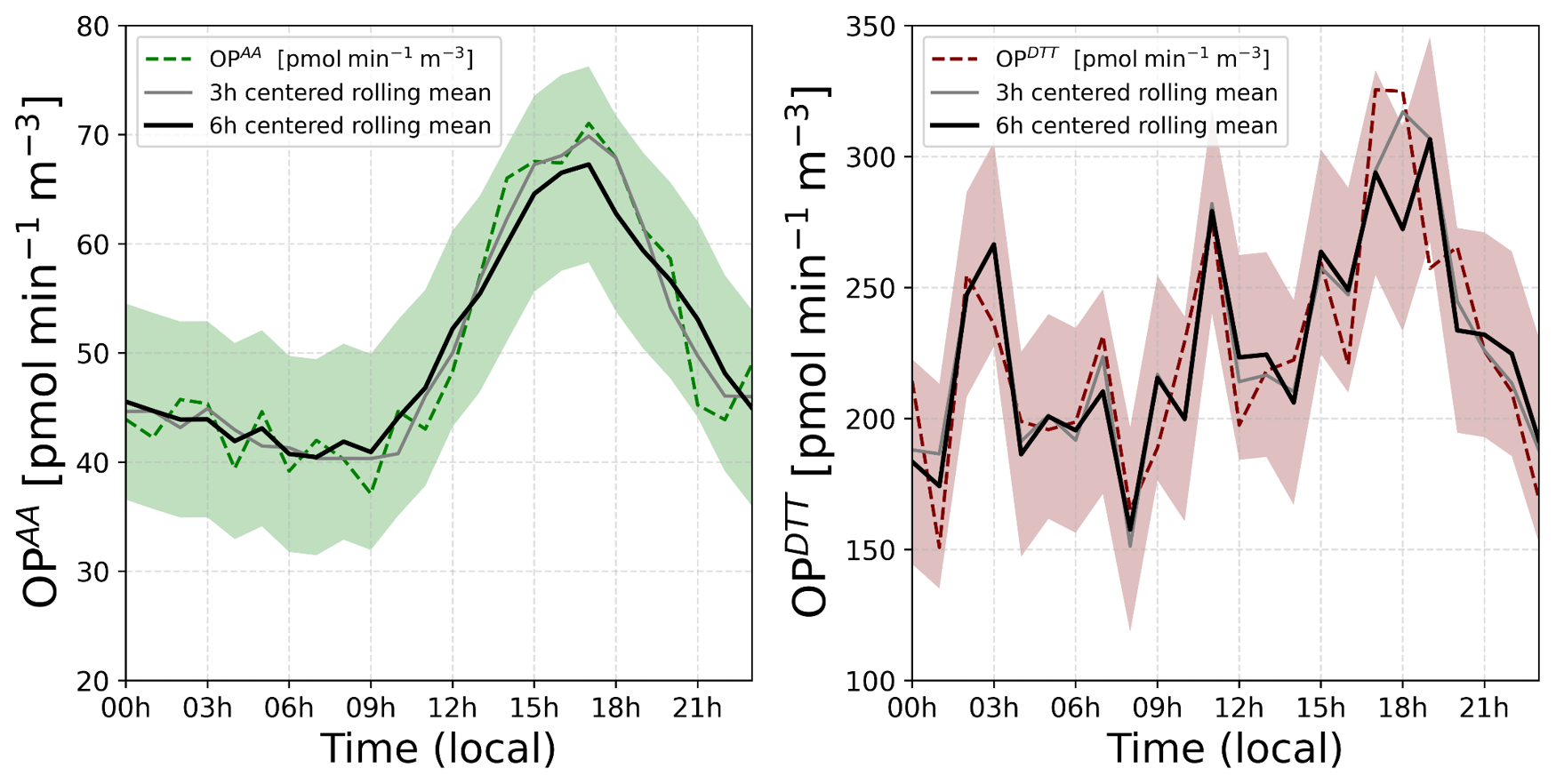 Figure 8Average diurnal cycle of 13 d of OPAA measurements (left) and of 6 d of OPDTT measurements (right) observed at Les Bossons [pmol min−1 m−3]. Dashed coloured lines show the averaged diurnal variation for all available measurements, grey and black lines the 3 and 6 h rolling means. Confidence intervals correspond to ± 1σ.