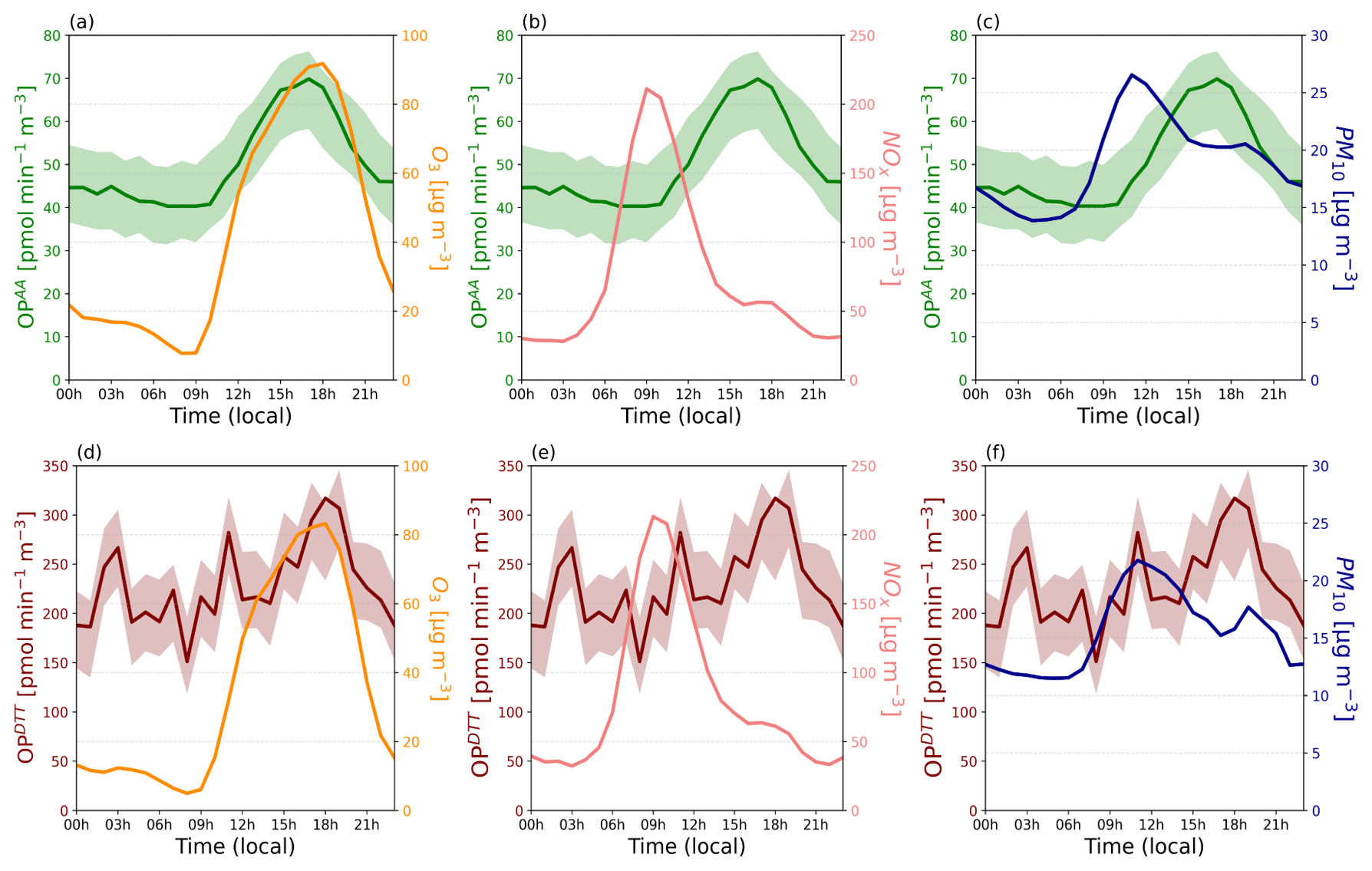 Diurnal cycles of both OPAA and OPDTT measurements do not show the same variations, reflecting the different sensitivity to the aerosol composition of these two probes. OPAA seems to stay at background level (40 pmol min−1 m−3) at night and then rises up around 09:00 until 16:00 LT, reaching twice its background value with a peak of ∼ 70 pmol min−1 m−3, before decreasing at a similar rate than its increase reaching background level again around midnight. The OPDTT signal is less structured with OP values ∼ 5 times that of OPAA at background value (midnight). OPDTT signal exhibits 3 main peaks at ∼ 03:00, noon and ∼ 18:00, reaching ∼ 300 pmol min−1 m−3 for the latter peak. The signal drops rapidly to its background level from 21:00 onwards.