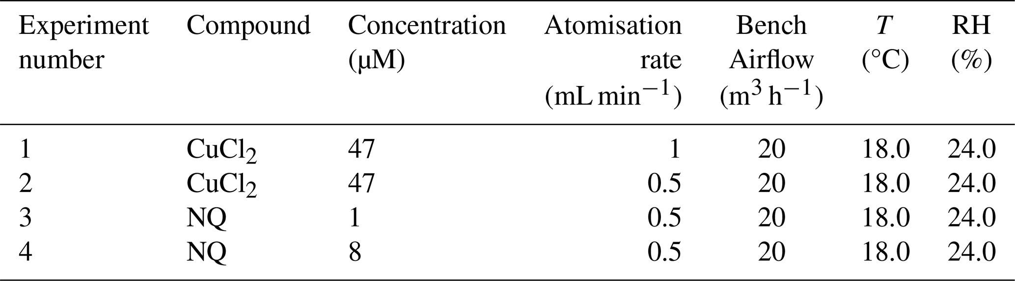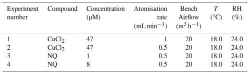 Four experiments were conducted with artificial solutions of CuCl2 and Naphthoquinone (NQ), both being major redox components of PM (Ayres et al., 2008; Charrier and Anastasio, 2012; Kumagai et al., 2002) to evaluate the ROS-Online response and to highlight the difference in reactivity of both probes. Experimental conditions are summarized in Table 2. ROS-Online collected over 20 min at 0.6 m3 h−1 (∼ 10.5 L min−1) inside the main air flow at 20 m3 h−1. An isokinetic calculation was performed to adjust the same velocity in the gas stream and in the ROS-Online sampling line. Laminar flow conditions were ensured by the distances between the disturbance zones and the tapping points, i.e., 3 times the pipe diameter upstream and 10 times the pipe diameter downstream. The size distribution of the particles generated during the four experiments is presented in Fig. S1 of the Supplement. Experiments 1 and 2 were conducted with a 47 nM CuCl2 solution atomised in the experimental bench at two different rates, 1 and 0.5 mL min−1, respectively, in order to achieve different concentration levels of PMs. Indeed, between experiments 1 and 2, PM concentrations changes from (64 ± 10) to (34 ± 5) µg m−3 for PM2.5 and from (59 ± 9) to (30 ± 5) µg m−3 for PM1. Experiments 3 and 4 were conducted using 1 and 8 mM solutions of NQ respectively, leading to PMs concentration levels of (215 ± 18) to (364 ± 18) µg m−3 for PM2.5 and (179 ± 6) to (323 ± 13) µg m−3 for PM1. Regardless of the concentration of the solutions or the atomisation rate, the nebulized particle generator produces a majority of PM1, with an average of (88 ± 4) % of the particles by mass having a diameter of 1 µm or less.