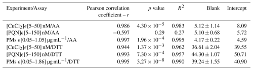 Table 3 reports the main characteristics of the linear regressions obtained with Cu(II) and PQN standard solutions and filter samples. Results are given without taking account the blank correction. As the intercept values are, to some extent, similar to the blank values, one can hypothesize that the non-zero intercept is likely related to the self-degradation of the antioxidants. This is supported by the fact that AA is sensitive to temperature and UV (Basak et al., 2023; Essodolom et al., 2020). In our protocol, the reacting solution containing AA is illuminated at 265 nm for 10 min in the FC and heated to 37 °C, thus explaining the self-consumption of AA in the ROS-Online device. Similarly, both DTT and TNB are also sensitive to light (Damodaran, 1985; Eyer et al., 2003). In that case, the solution in the FC is illuminated at 412 nm for 15 min, resulting in the self-degradation of these reactants and finally to non-zero intercepts we observed for the DTT assay. The consideration of this issue subsequently led us to systematically perform a blank for each real atmospheric measurement. The difference in blank values observed for AA (4 to 5 pmol min−1) and for DTT (37 to 44 pmol min−1) assays may be due to the quality of the solutions used, particularly of the ultrapure water used either for the standards solutions or for the PM extracts. Additionally, the difference in blank values observed between both assays is probably due to the kinetics itself (reaction time, wavelength etc.).