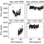 XCH4 from Arctic TCCON stations can sometimes exhibit a significant residual air mass dependence that is not corrected by the network-wide airmass-dependent correction. (Inverted) U shapes of diurnal XCH4, which are symmetric around noon, are a strong indicator for an AMD, since there is no reasonable geophysical explanation for diurnal XCH4 variations of this magnitude. Diurnal variability in the Arctic winter and spring is relatively weak and most likely driven by transport from lower latitudes (AMAP, 2015). This cannot account for the observed symmetric CH4 signals, either in amplitude or for its systematic occurrence. Figure 3 shows XCH4 as a function of time and SZA for 2 exemplary days of standard TCCON data with and without AMD from the Ny-Ålesund site.