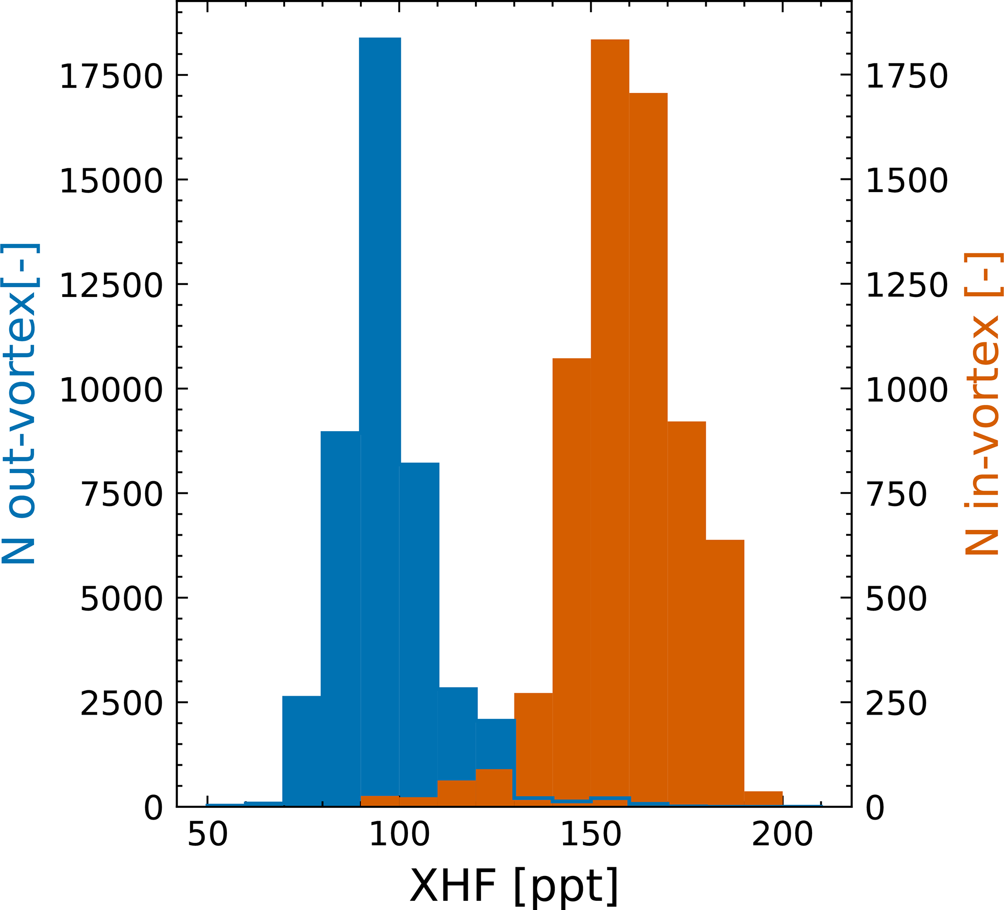 Figure 2Histograms of in- and out-of-vortex XHF from TCCON Ny-Ålesund data. The histograms for in- and out-of-vortex data are well separated, indicating that XHF can be used as a proxy for the presence of vortex air. The in- and out-of-vortex assignment was done using a polar vortex mask generated from ERA5 data.