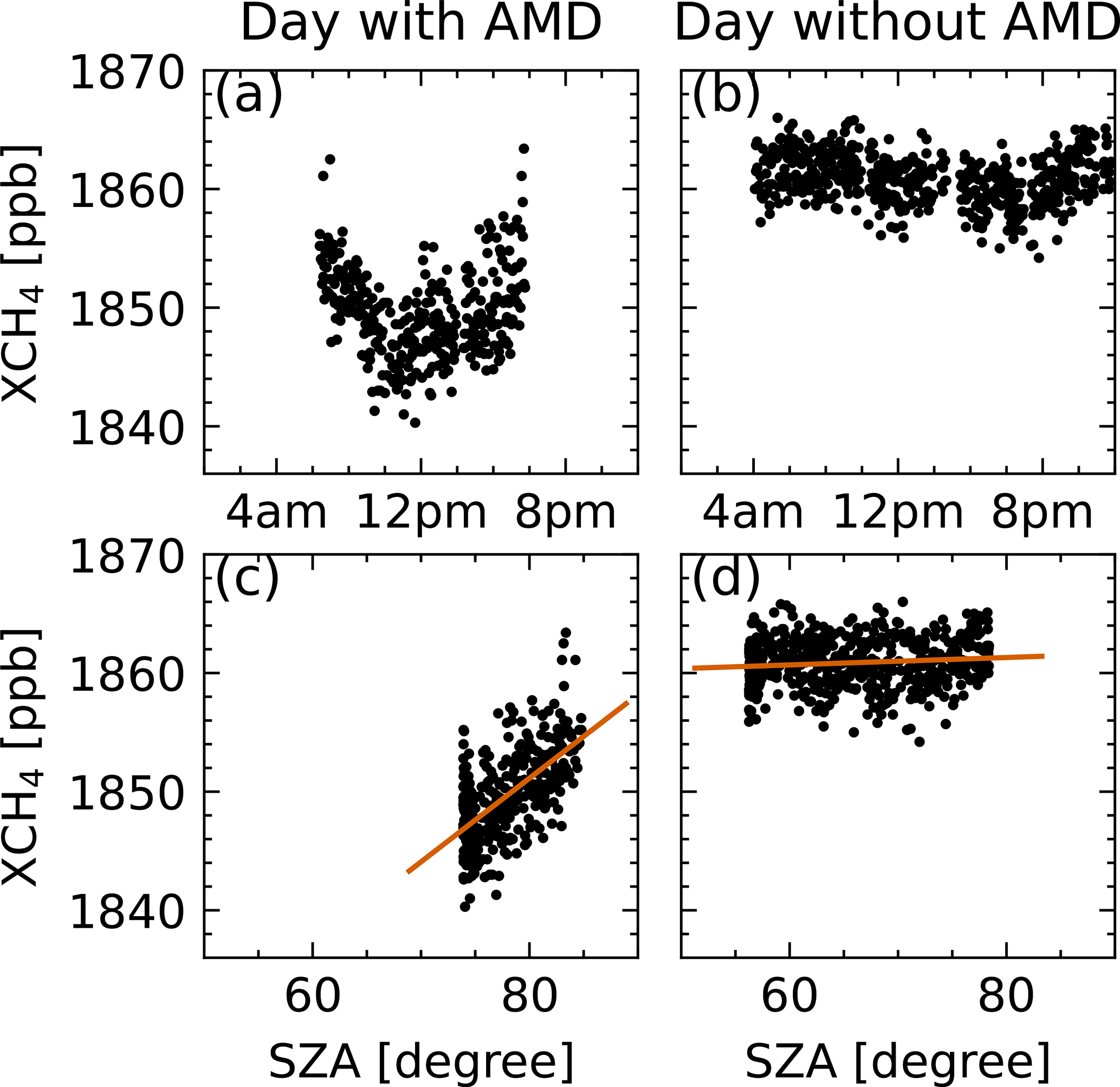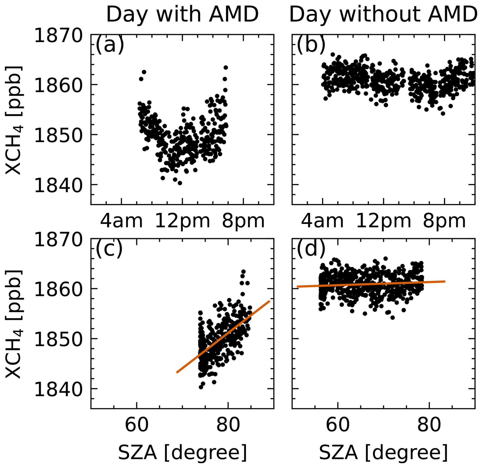Figure 3Panels (a) and (c) showcase XCH4 for a day with AMD. Panels (b) and (d) showcase XCH4 for a day without AMD. Data are from the Ny-Ålesund TCCON station. Panel (a) shows a day with AMD, as visible in the u-shaped XCH4 centered around the local noon. The AMD is also visible in the linear relationship between XCH4 and SZA in panel (c). Panel (b) shows a day without AMD and hence no visible symmetry around noon. Consequently there is no clear slope in panel (d).