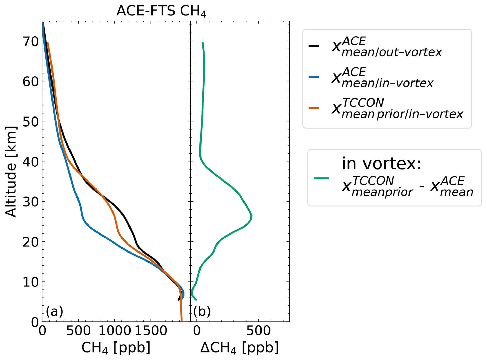 Figure 6(a) Mean in- and out-of-vortex CH4 profiles from ACE-FTS measurements and mean inside-vortex standard TCCON CH4 prior (averaged over NYA, SOD, EUR, ETL). For the calculation of mean profiles, measurements between 2009 and 2022, from January to May and north of 50° N, were used. Panel (b) shows the difference between the mean TCCON prior and mean ACE-FTS profile inside the vortex.