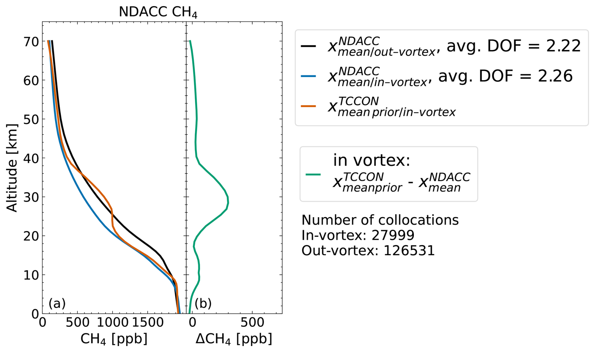 Figure 7(a) Mean in- and out-of-vortex NDACC CH4 profiles and mean inside-vortex standard TCCON CH4 prior (averaged over NYA and EUR). Panel (b) shows the mean difference between the TCCON prior and NDACC profile inside the vortex. The number of profiles used to calculate the mean profiles is shown below the legends.