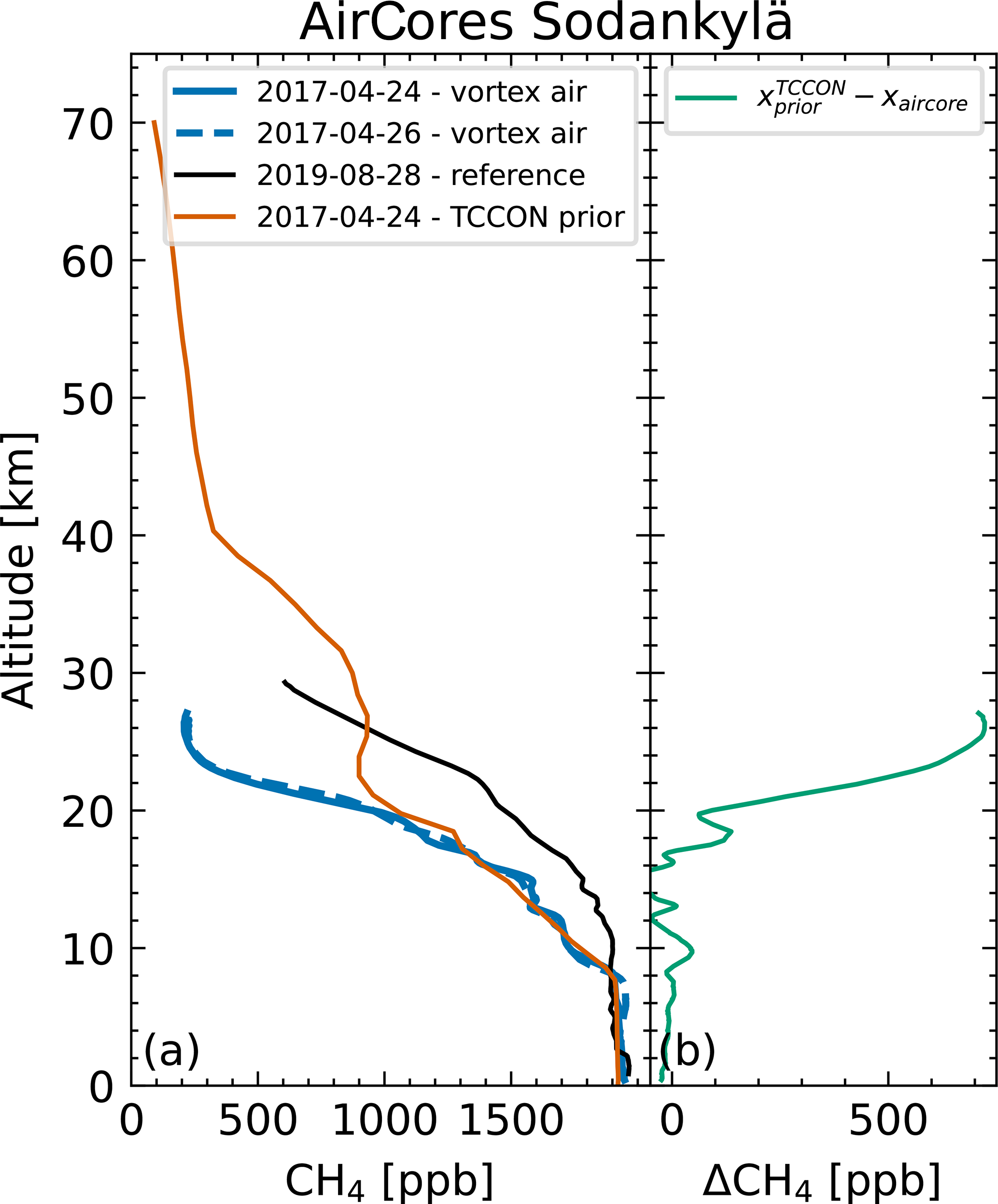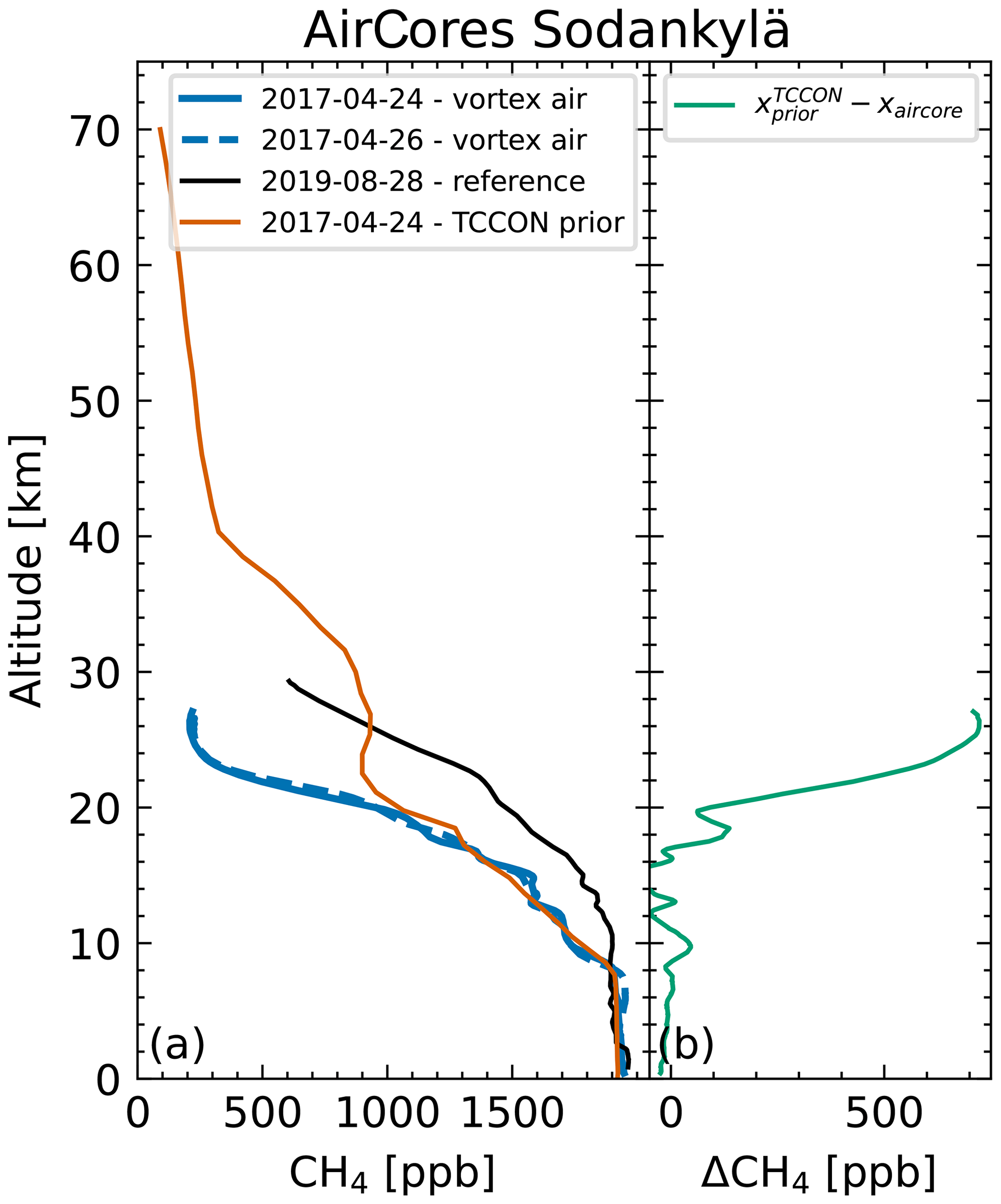 Figure 8(a) CH4 profiles from AirCores at Sodankylä. The two AirCores measuring vortex air show a distinct reduction of CH4 in the upper atmosphere compared to out-of-vortex AirCores (Karion et al., 2010) measuring at a similar time of the year. Additionally, significant differences are visible between the AirCore profile and the corresponding TCCON prior profile. The difference between them is shown in panel (b).