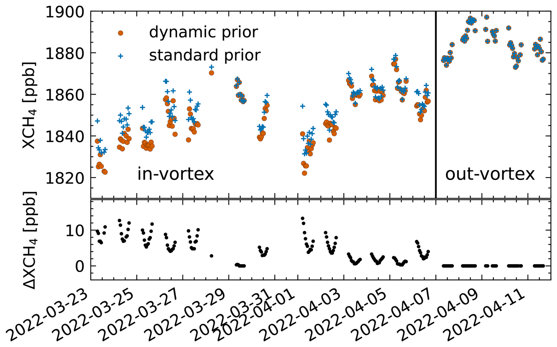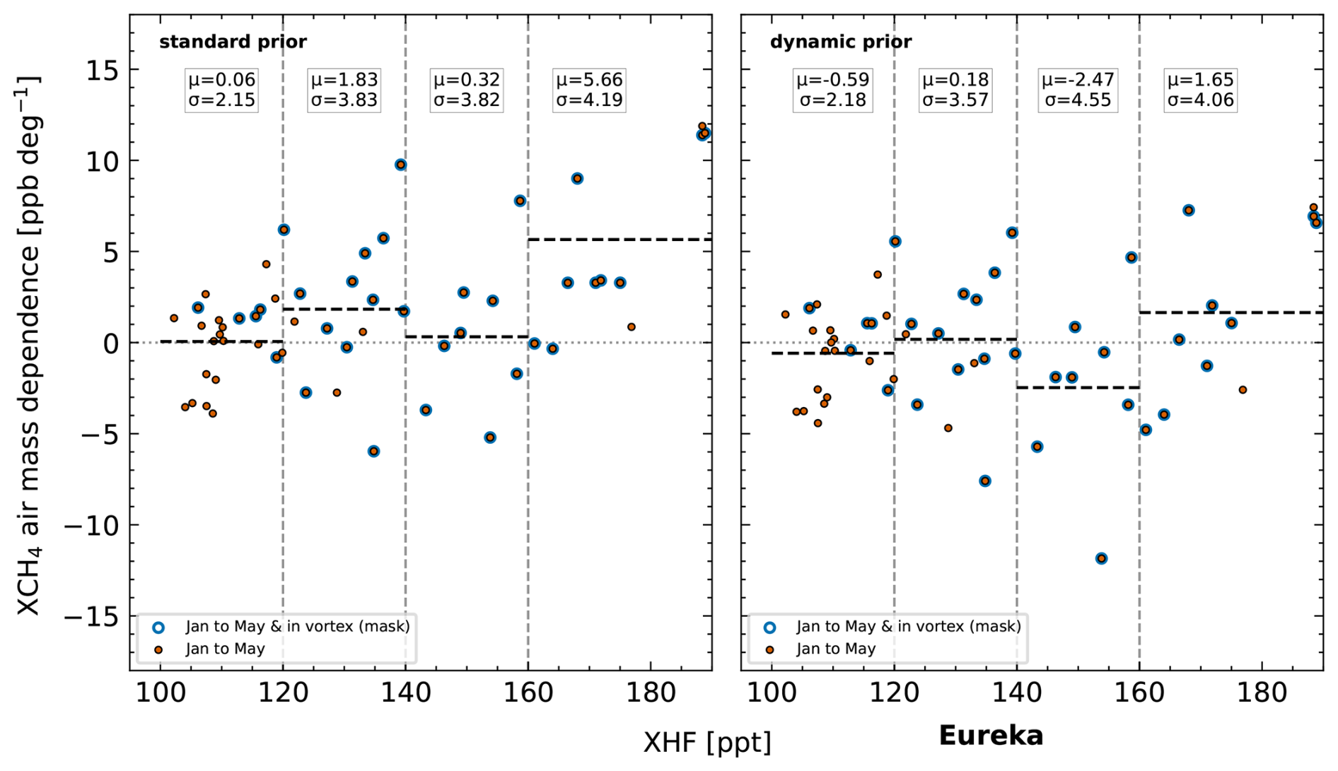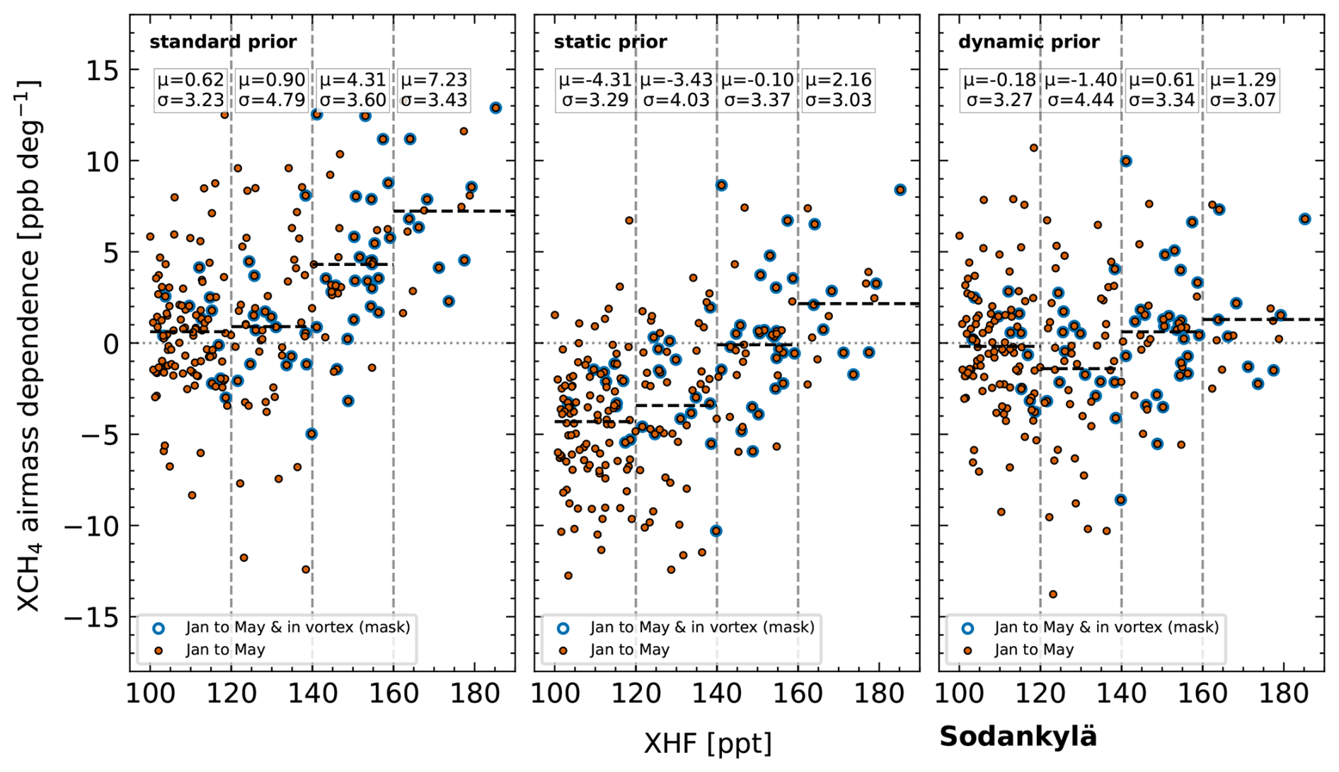 For NYA, an increasing AMD can be observed with values up to μ = 4.82 ppb per degree. The static prior was especially designed for inside-vortex measurements and thus yields a significant reduction in AMD for high-XHF measurements (which are mostly flagged as inside vortex). For XHF < 140 ppt, the AMD is, however, significantly increased to negative values. The dynamic prior was designed for measurements with XHF > 100 ppt and leads to an overall improvement with a lower mean AMD below μ = 1.06 ppb per degree. For NYA, we also tested the model prior as shown in Fig. 11; the improvement is similar to that of the dynamic prior. The corresponding standard deviations vary little between the different priors, suggesting that AMDs independent of the polar vortex are present in the data, which remain mostly unchanged by our modifications.