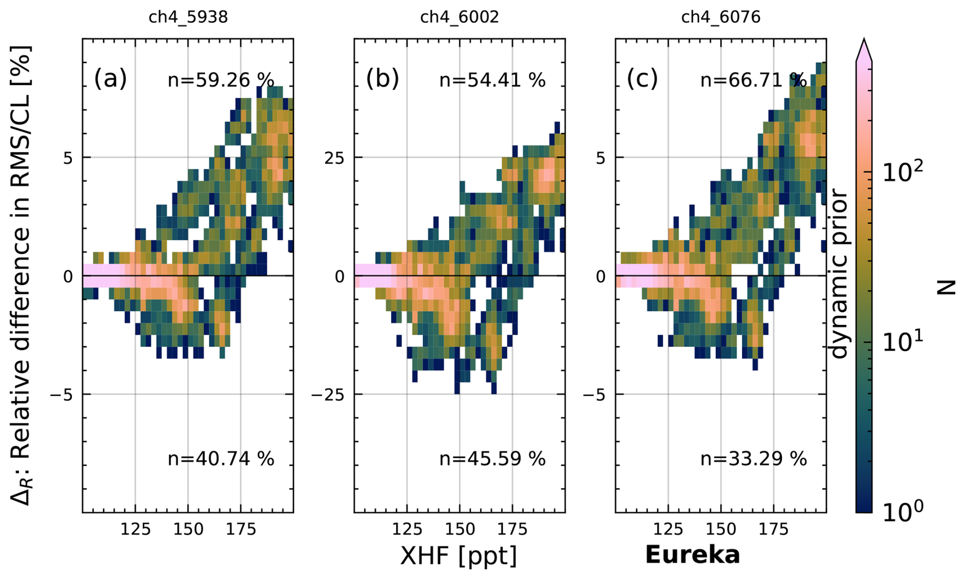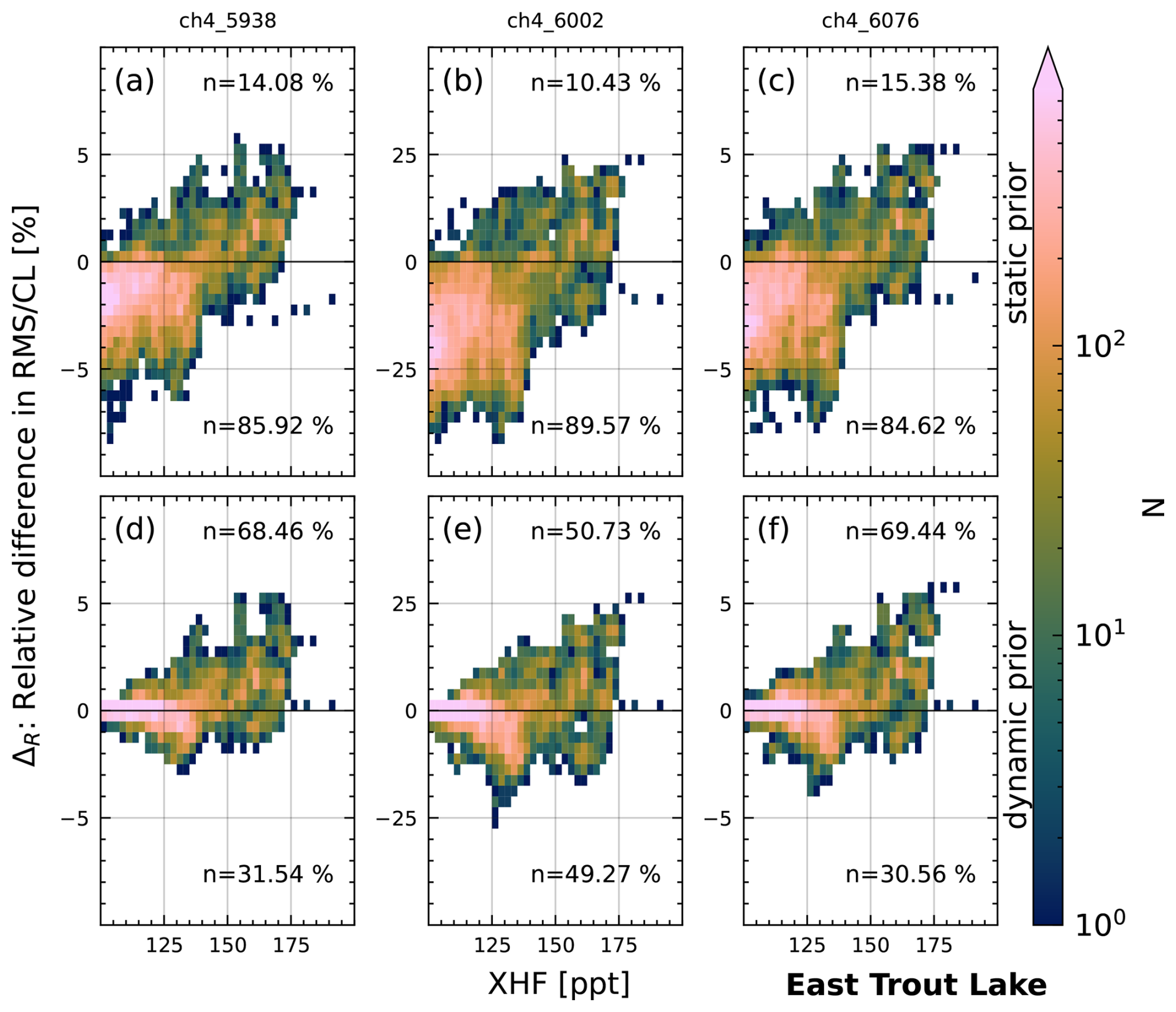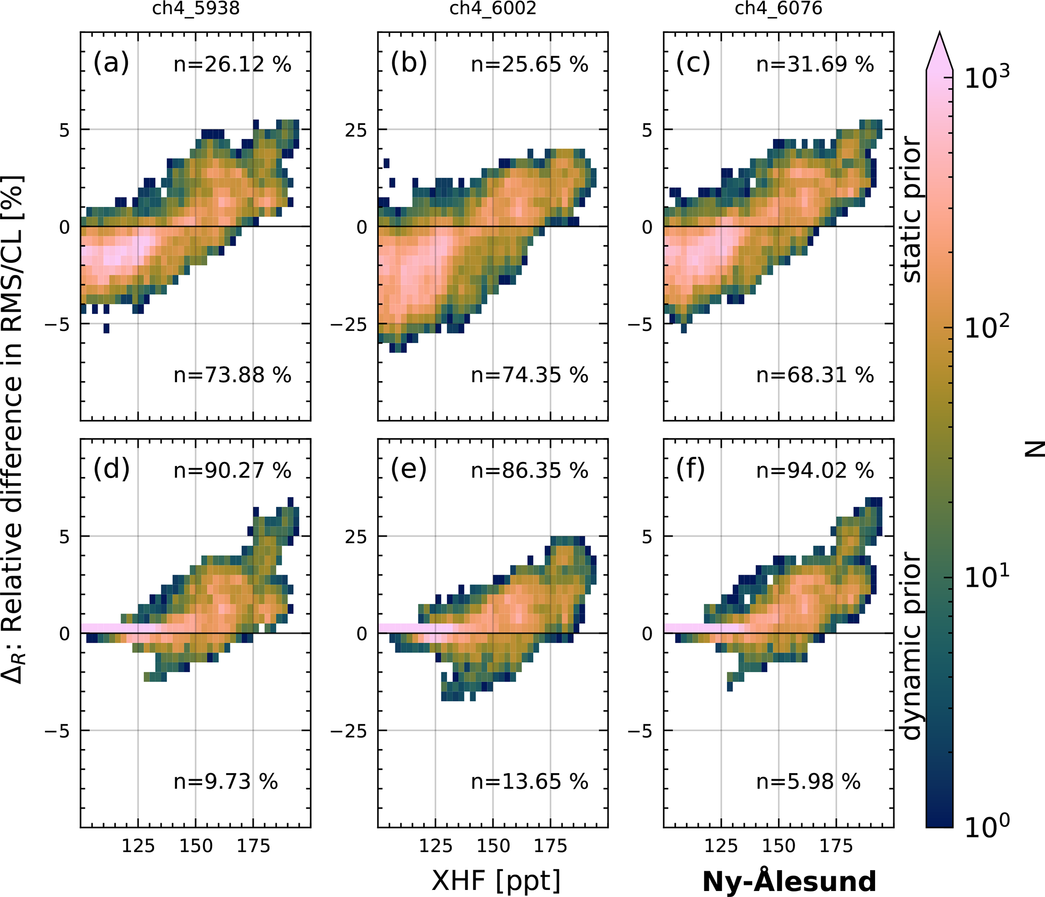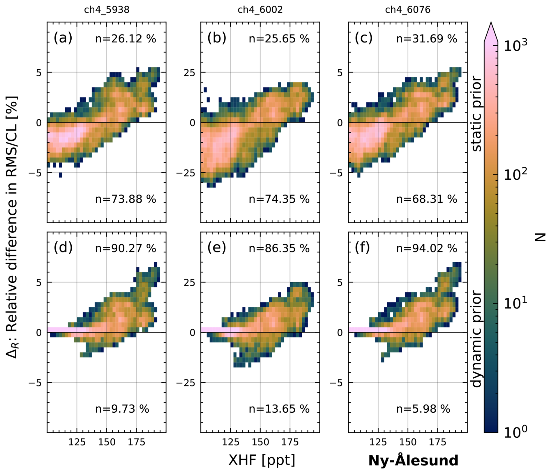 First, we investigate the improvement in spectral fits for NYA for which all three different prior modifications are available. Figure 15 shows the improvement in RMS/CL compared to the standard retrieval (ΔR) for all three modified priors and fitting windows using a 2D histogram. The color bar is logarithmically scaled, displaying the number N of spectra per bin. Additionally, we show the percentage n of spectra for the upper half (improvement of fit) and lower half (decline of fit) of each panel. Note that we only investigate spectra with XHF > 100 ppt, which is the lower cutoff value for modification with the dynamic prior and static prior. The largest differences can be seen for the window centered on 6002 cm−1, which includes the Q branch of the CH4 absorption band (middle column), on which we focus for now. For the static prior, the ΔR declines up to 25 % for most XHF values below 150 ppt and increases by 20 % for values above 150 ppt. The dynamic prior shows improvements of ΔR increasing with XHF and maximum improvements of 25 % at roughly 175 ppt. However, some spectra with ΔR reduced by up to 10 % are also present. The other fit windows show similar results with a lower range of ΔR between −5 % and 7 %.