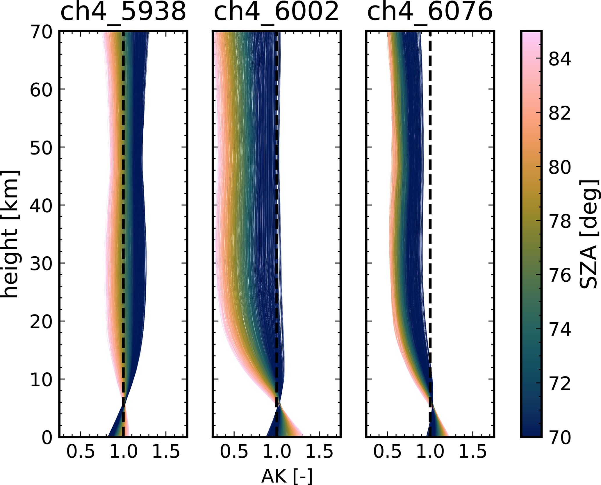 Figure 19 shows the AKs for 1000 randomly sampled spectra from NYA with XHF > 100 ppt between January and May using the standard prior. The 6002 and 6076 cm−1 windows show a similar shape, with values below 1 in the stratosphere and values above 1 in the troposphere. However, the 6002 cm−1 window shows a stronger deviation from 1, with values down to 0.3 in the stratosphere compared to 0.6 for the 6067 cm−1 window. The 5938 cm−1 window shows a similar shape for SZAs larger than roughly 77°. Below this threshold, the AK is above 1 in the stratosphere and below 1 in the troposphere. The deviation from 1 is relatively small in this window, with values ranging between 0.8 and 1.2. In general, the AK is increasingly deviating from 1 for high SZAs, as we have already seen in Fig. 5.