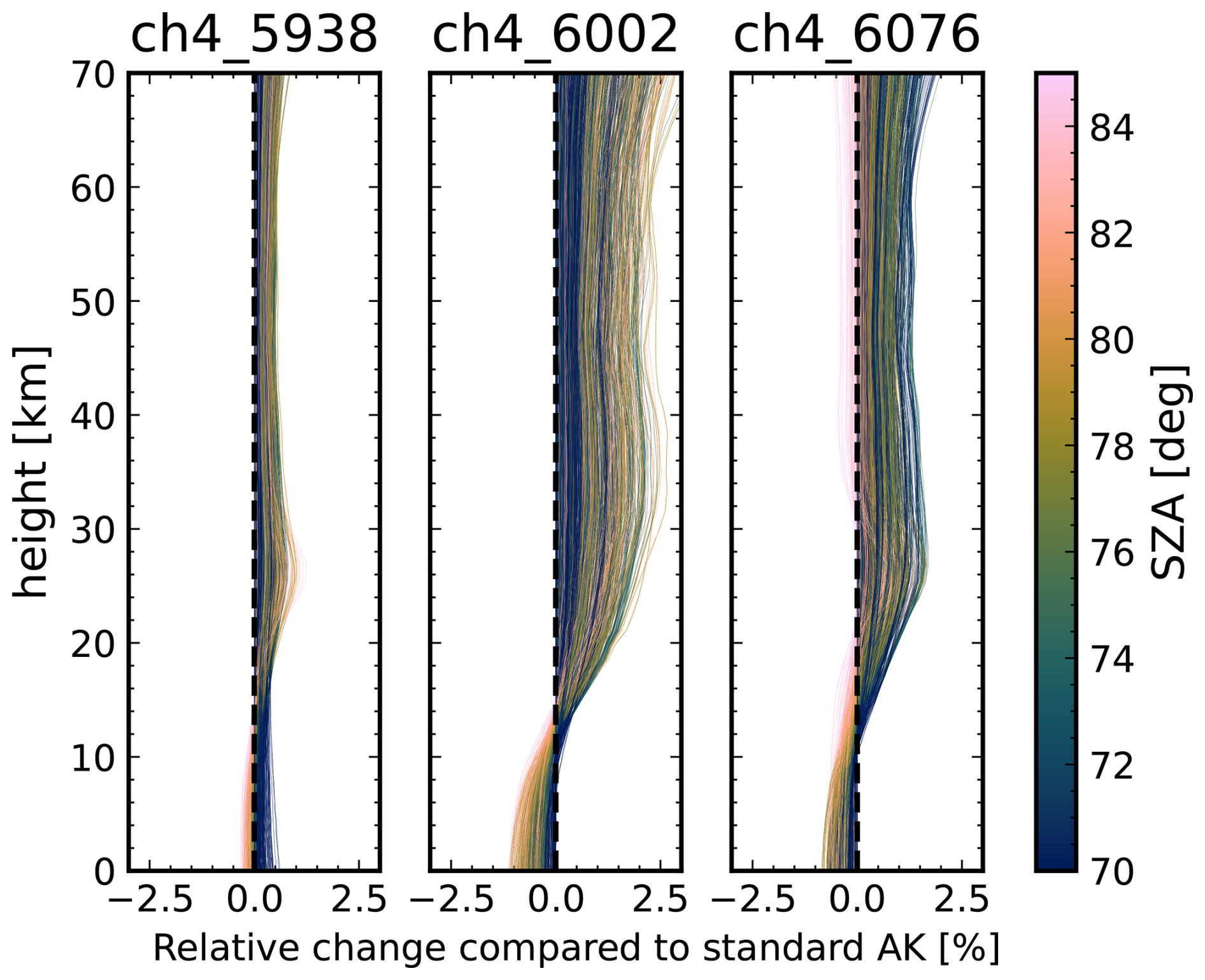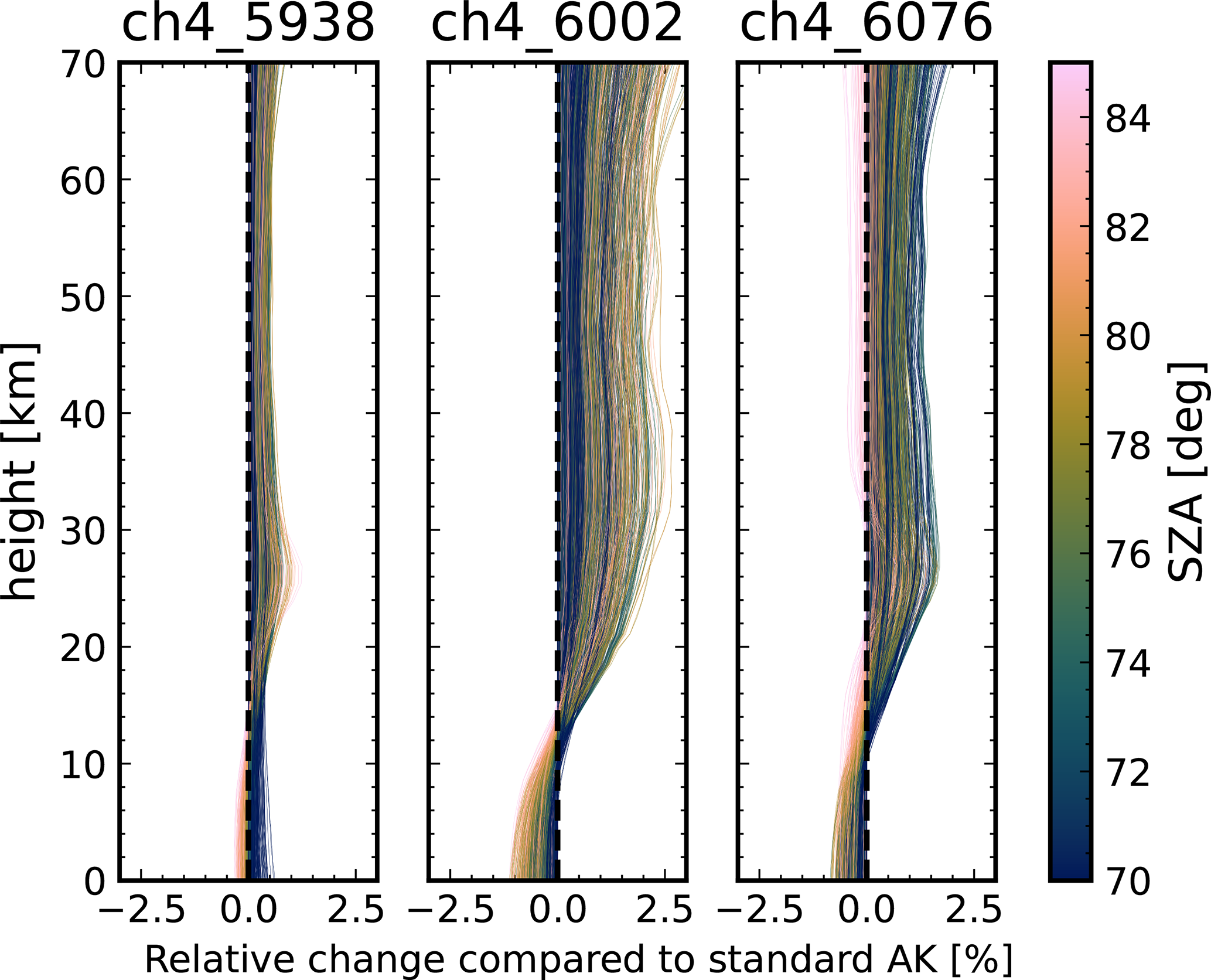 Returning to Eq. (2) we can now explain part of the observed AMDs. During measurements under high-SZA conditions, the averaging kernel is small in the stratosphere and large in the troposphere. This is important, since smaller AK values mean that more information comes from the prior profile (in an idealized measurement with A = 1 all information comes from the measurement). If the shape of this prior profile is sufficiently wrong, this leads to AK- and hence SZA-dependent artifacts in the XCH4 (an air mass dependence), which are proportional to the difference between the true and prior CH4 profile.
