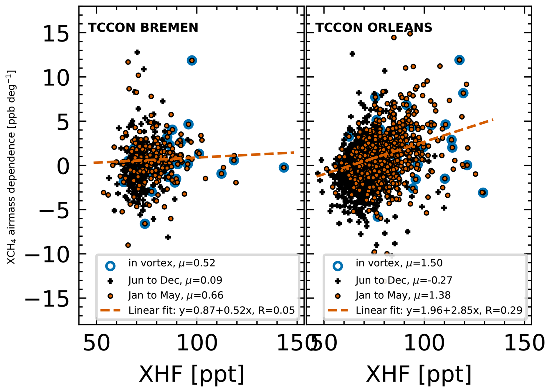 Figure D1Daily AMD as a function of daily averaged XHF for two mid-latitude sites. The AMD is defined as the slope of a linear function fit between XCH4 and the solar zenith angles for each day. Mean values (μ) are provided for data flagged as inside vortex, for January to May and June to December. Additionally, linear fits are calculated from January to May; R is the Pearson correlation coefficient.