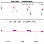 This spectral extension R of the solar spectral irradiance measurements using the machine leaning approach enabled a robust comparison with TSI measurements from the cavity radiometer (PMO2). The top panels of Fig. 6 show the time series of TSI from both PMO2 and BTS spectroradiometer while the lower plots illustrate the ratio between the TSI of both instruments. The left panel displays the SI traceable comparison between the BTS spectroradiometer and PMO2 for selected days in March 2025 (4 to 7 March 2025), while the right panel illustrates the corresponding comparison over the entire analysis period from January 2024 to March 2025. In both cases, the WRR-to-SI offset of −0.34 % (Fehlmann et al., 2012; IPC-XII, 2016) has been applied to ensure traceability to the SI. When the WRR-to-SI offset is incorporated in the data of the PMO2 radiometer, the resulting ratio between the TSI values measured by the BTS Spectroradiometer and the reference cavity radiometer is 1.0008 with a standard deviation of 0.0050 (see Fig. 6b). This demonstrates the excellent agreement of the TSI retrieved by the BTS spectroradiometer with the WRR instrument PMO2 cavity radiometer, thereby confirming that the validation have been successfully met.