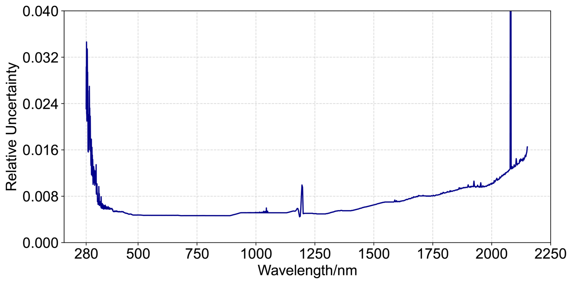 Figure 1Relative spectral uncertainty of direct spectral solar irradiance measurements presented as a function of wavelength. The localized relative uncertainty spike near 2080 nm is attributed to instrumental noise at the corresponding spectral pixel (hot pixel) and has been removed from the later analysis.