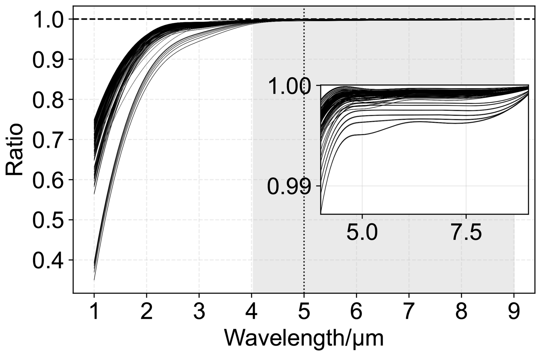 Figure 2Ratio of spectral irradiance at each wavelength to the total spectral irradiance, illustrating the cumulative contribution of different wavelengths and different conditions typical of Davos. The grey shaded area represents the spectral interval contributing more than 98 % of the total solar irradiance (TSI). The vertical dotted line marks the maximum upper limit of wavelength adopted for the study. The horizontal line at 1 represents the normalized maximum contribution of shortwave solar radiation. The inset highlights the long-wavelength region (4–8 µm), where the residual contribution becomes negligible.
