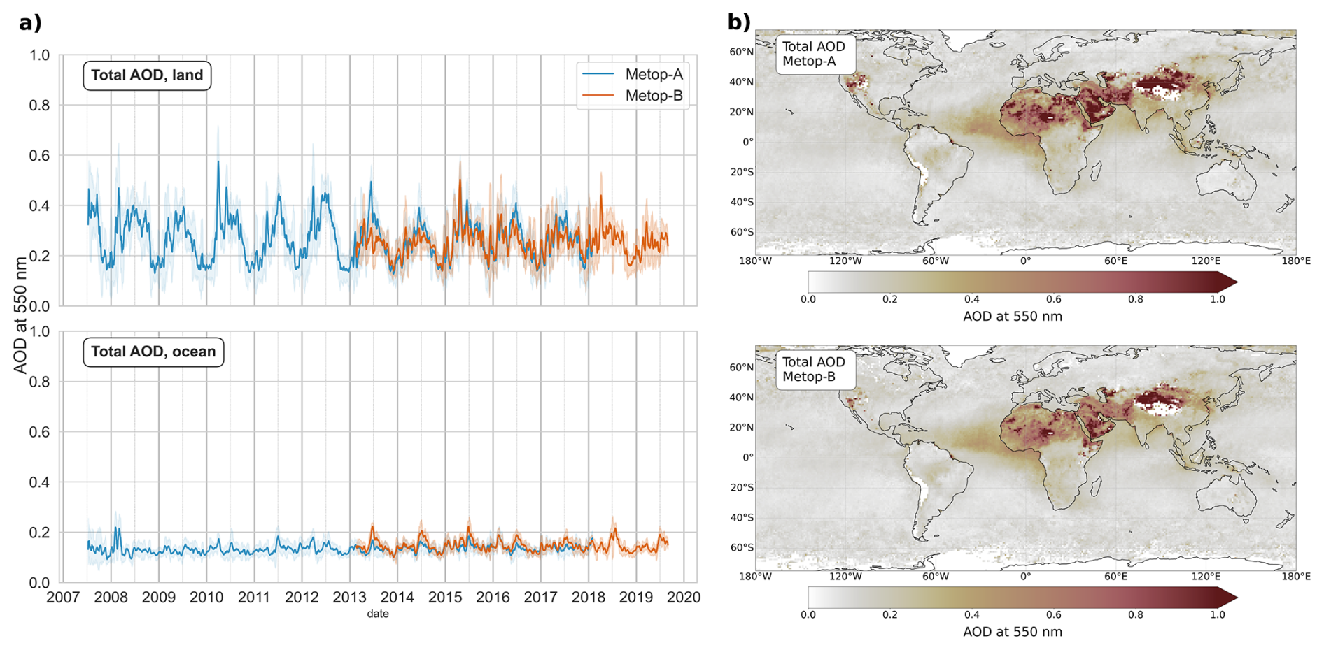Figure 1(a) Global mean of PMAp CDR for Metop-A (blue) and -B (orange) of total AOD over land (upper panel) and over ocean (lower panel). Shaded areas represent the AOD standard deviation. (b) An example of PMAp CDR annual mean of total AOD for 2015.