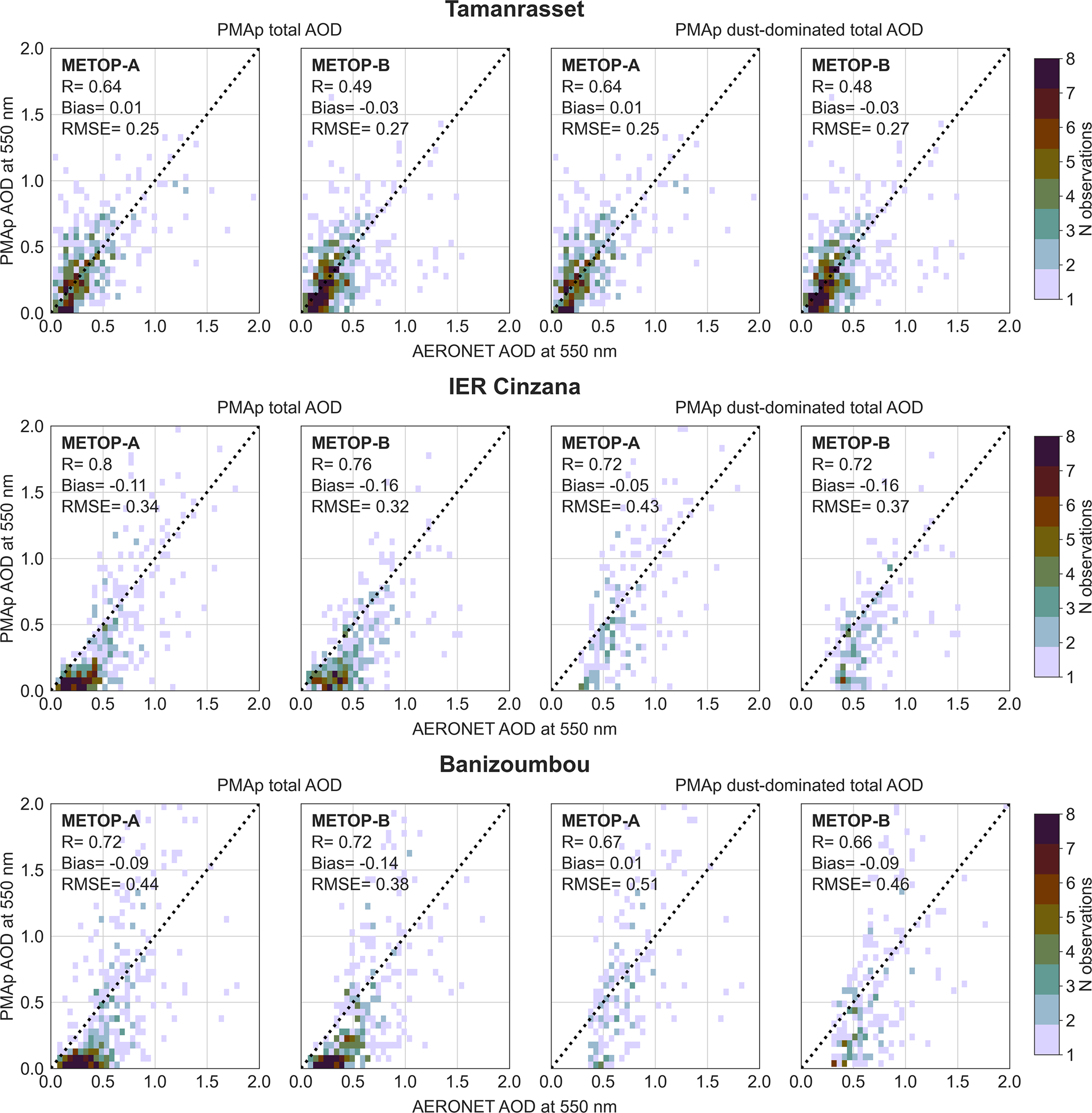 Figure 5Comparison of PMAp AODs against AERONET at three Saharan African stations: Tamanrasset (Algeria), IER Cinzana (Mali), and Banizoumbou (Nigeria). The color scale indicates number of observations, while black dashed line represents the 1 : 1 line.