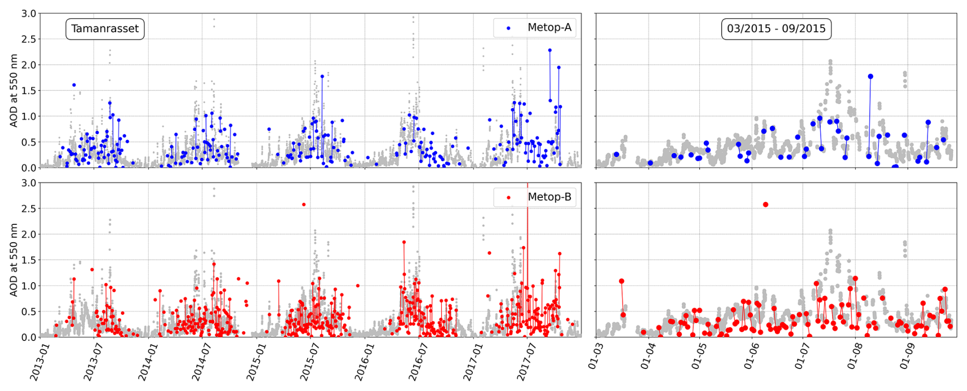 Figure 6Temporal variation of dust-dominated total AOD measured by PMAp for Metop-A (blue) and Metop-B (red). The left panel displays data from January 2013 to December 2017, while the right panel focuses on the period from March 2015 to September 2015 at Tamanrasset, alongside AERONET total AOD measurements (grey). Those PMAp points connected by a line are observations from two consecutive days.