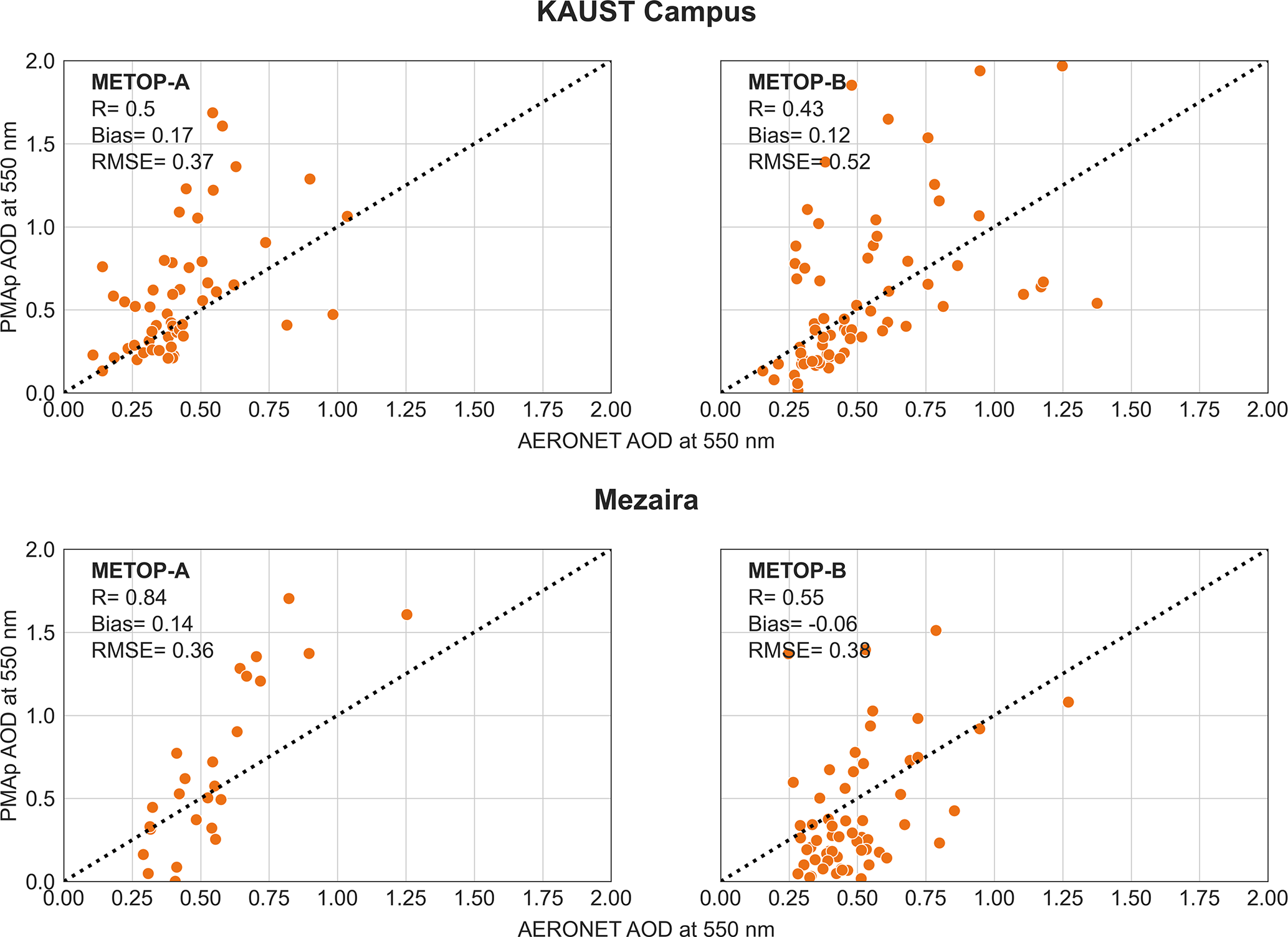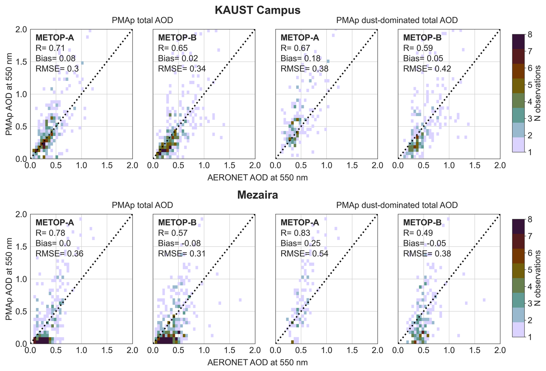 Figure 7Comparison of PMAp AODs against AERONET in KAUST Campus (Saudi Arabia) and Mezaira (Unites Arab Emirates). The color scale indicates number of observations, while black dashed line represents the 1 : 1 line.