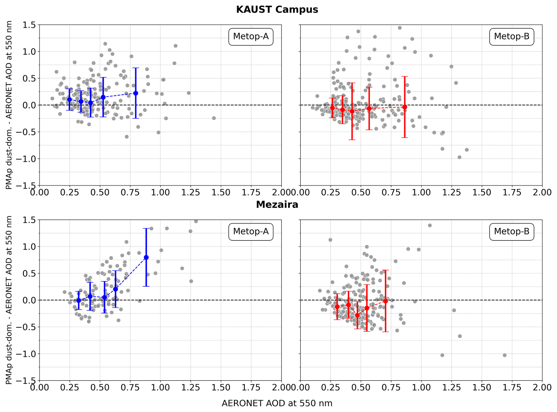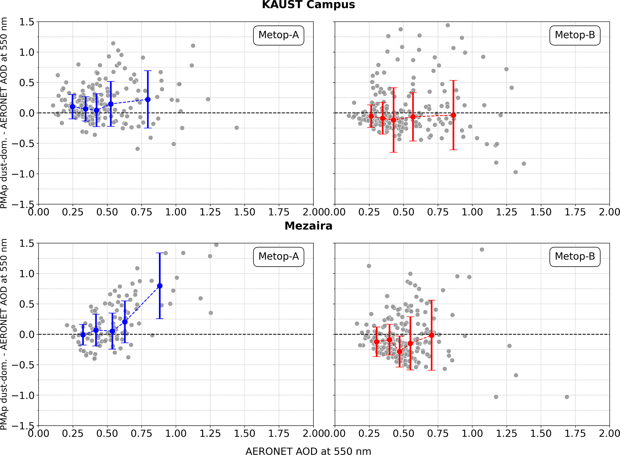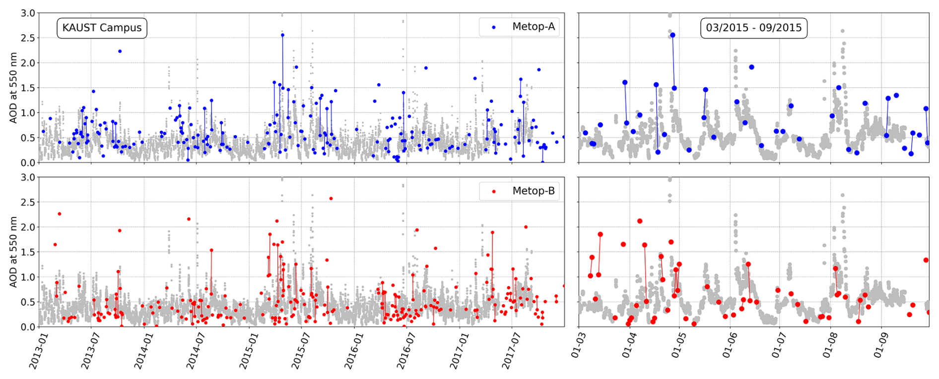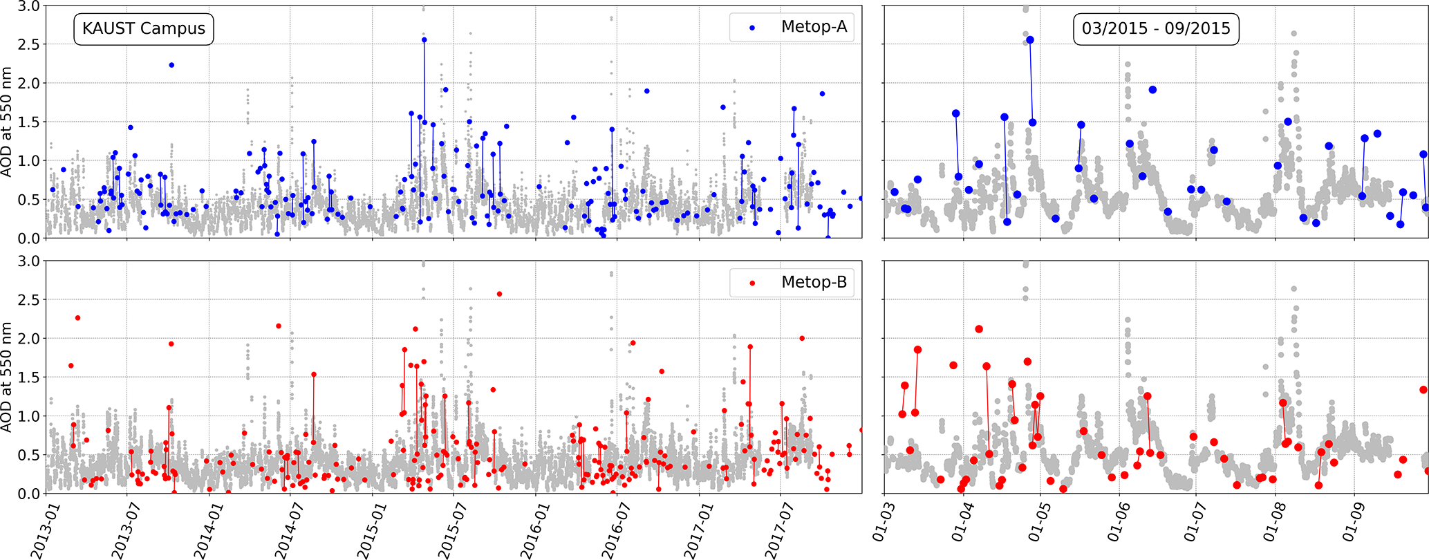 As shown in the time series for KAUST Campus (Fig. 8), the seasonal variation of AOD is somewhat less distinct compared e.g. to Tamanrasset (Fig. 6). Although PMAp dust-dominated data sampling is somewhat sparser at KAUST Campus, both (Metop-A and -B) PMAp dust-related time series generally capture the dynamic variations well. A notable period of increased dust activity between May and August 2015 (right panel, Fig. 8) is successfully detected by both satellites. However, at the same time occasional outliers in the PMAp dust-dominated AODs are observed for both satellites. While some of the higher PMAp dust-dominated AOD values are clearly associated with actual dust episodes, no single clear cause for these sporadic outliers in the PMAp CDRs could not been identified in this analysis.