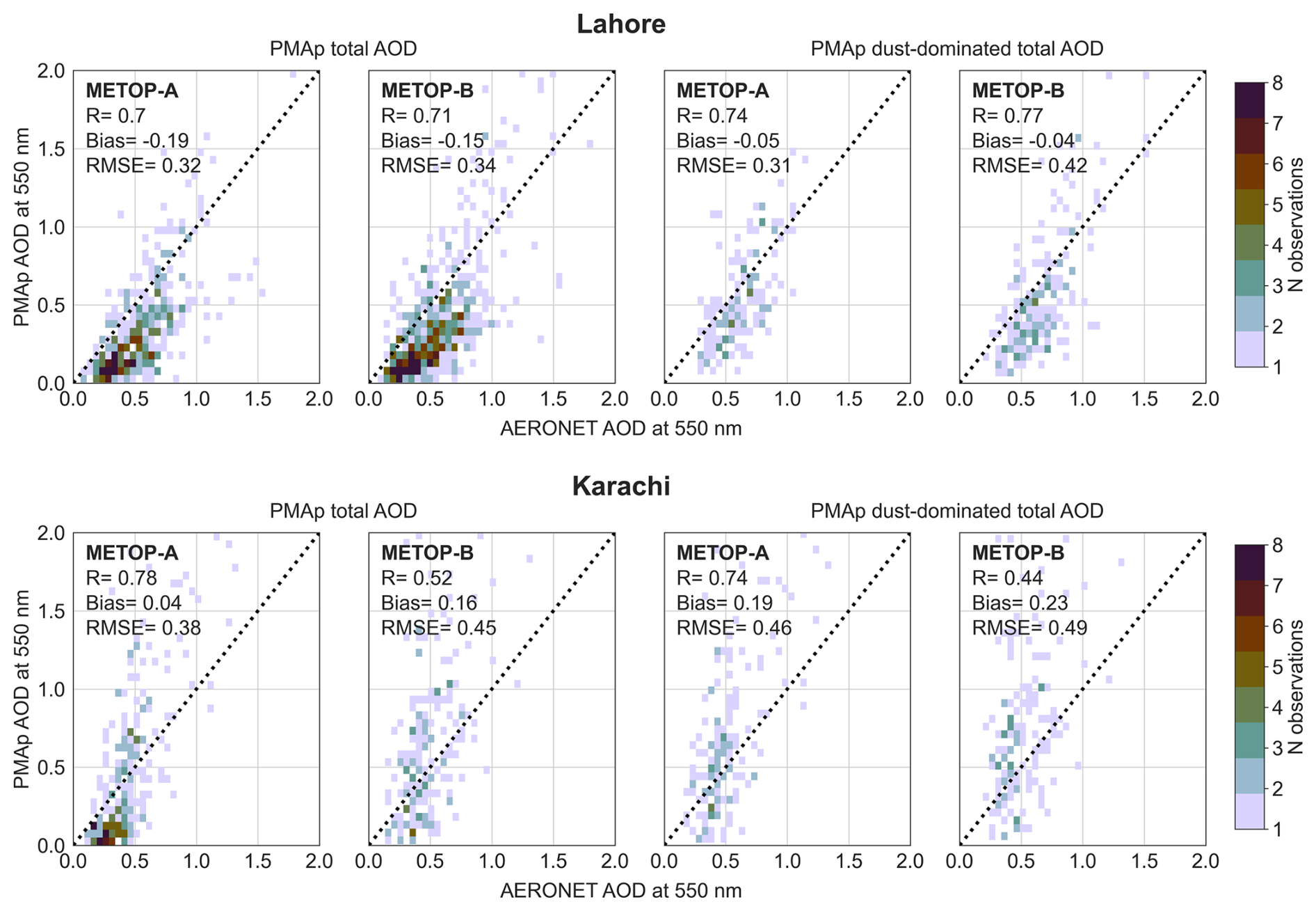 Figure 9Comparison of PMAp AODs against AERONET in Lahore and Karachi (Pakistan). The colour scale indicates number of observations, while black dashed line represents the 1 : 1 line.