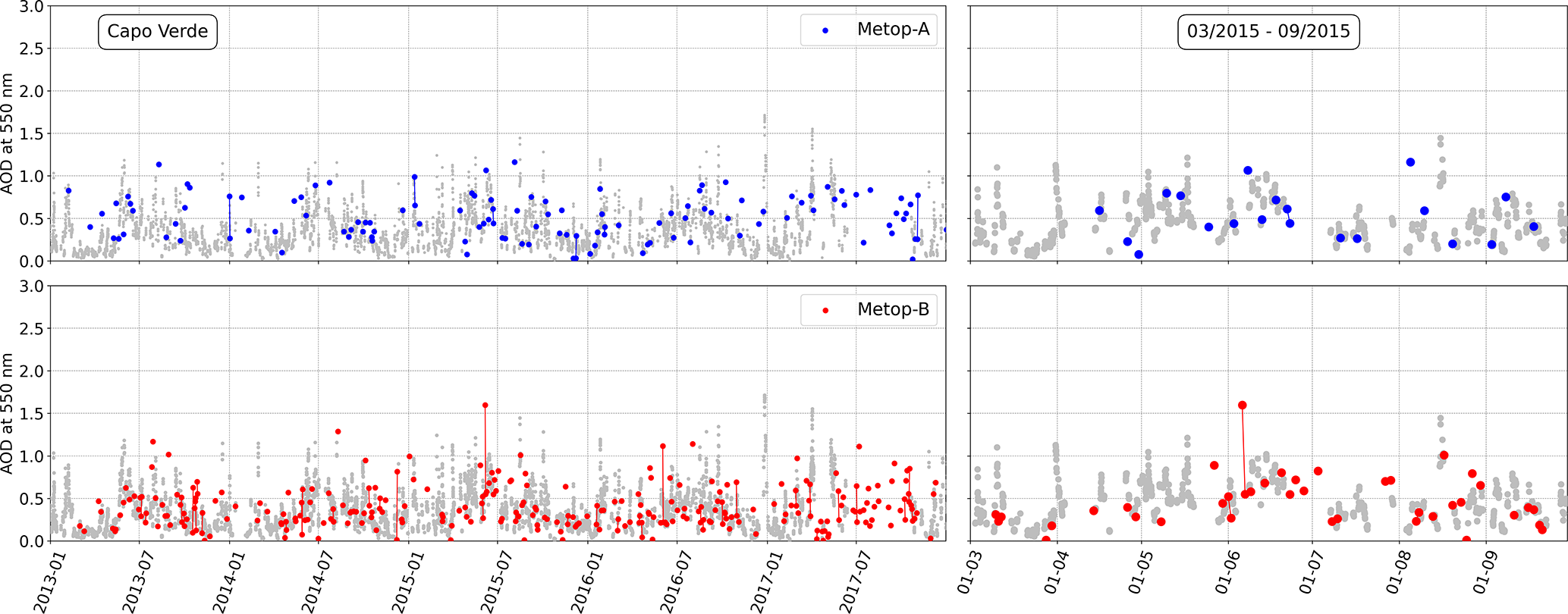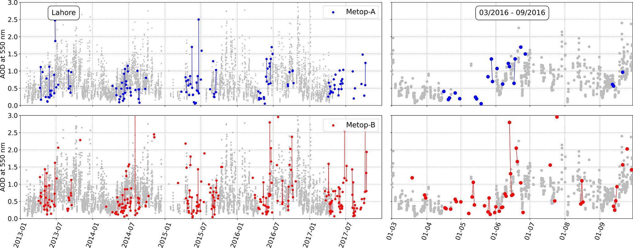 Figure 10Temporal variation of dust-dominated total AOD measured by PMAp for Metop-A (blue) and Metop-B (red) at Lahore. The left panel displays data from January 2013 to December 2017, while the right panel focuses on the period from March 2016 to September 2016, alongside AERONET total AOD measurements (grey).