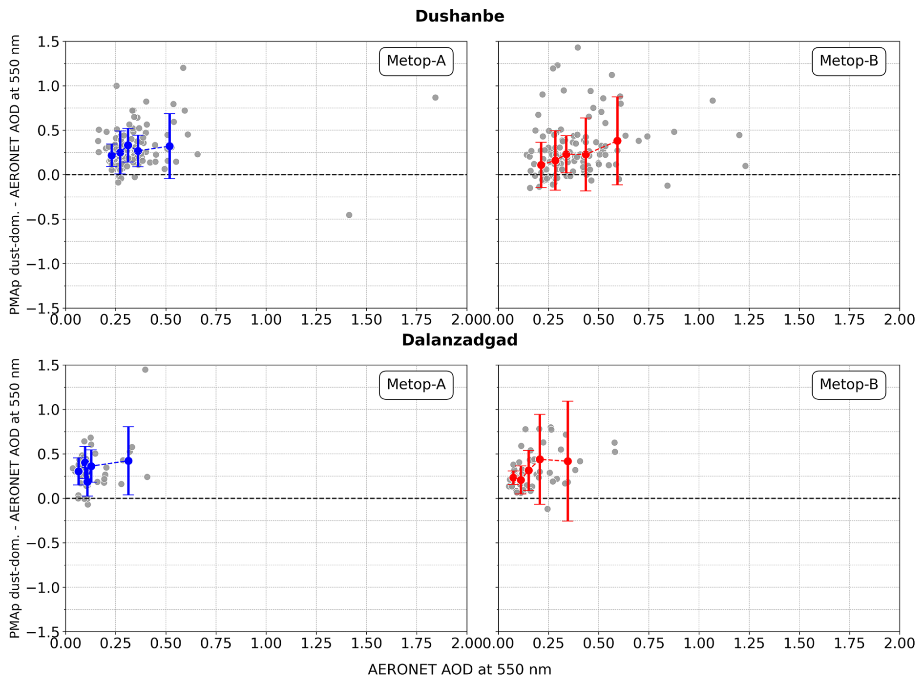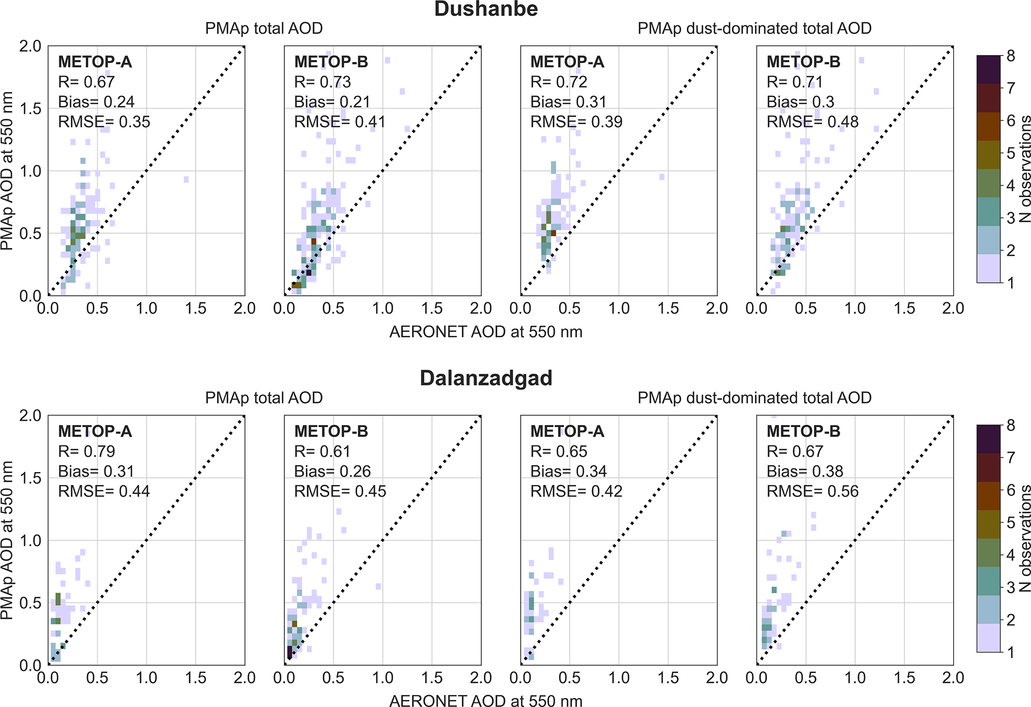 Dushanbe and Dalanzadgad, located in the northern part of Central/Eastern Asia, are also influenced by anthropogenic activity, though to a lesser extent than Lahore and Karachi. The region, especially close to Dushanbe, spans complex mountainous terrain and can experience seasonal snow cover. At both stations, ground-based AERONET AOD values remain relatively low (< 0.5). However, PMAp total AOD and dust-dominated total AOD exhibit systematically high positive mean biases (0.21–0.38) and substantial RMSEs (0.35–0.56, Fig. 11). At Dushanbe, the biases and RMSEs are the highest among all stations in this study. It is also noted that the number of collocated PMAp observations for both Metop-A and Metop-B is the lowest in this area. The AERONET dust filter could only be applied at Dushanbe, as the remaining number of collocated observations at Dalanzadgad was insufficient. Regardless, the RMSEs for PMAp dust-dominated total AODs exceed the mean AERONET AOD (with and without the dust filter), highlighting a substantial level of error relative to the observed values at these stations.