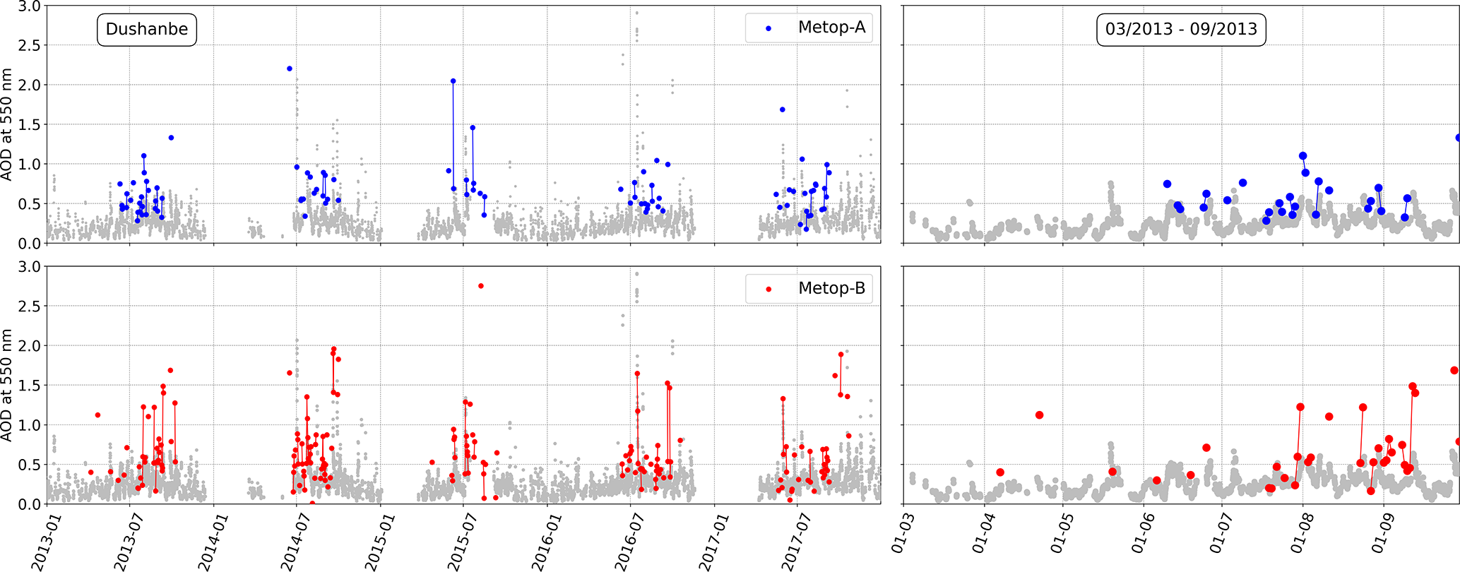 Figure 12Temporal variation of dust-dominated total AOD measured by PMAp for Metop-A (blue) and Metop-B (red) at Dushanbe The left panel displays data from January 2013 to December 2017, while the right panel focuses on the period from March 2013 to September 2013, alongside AERONET total AOD measurements (grey).