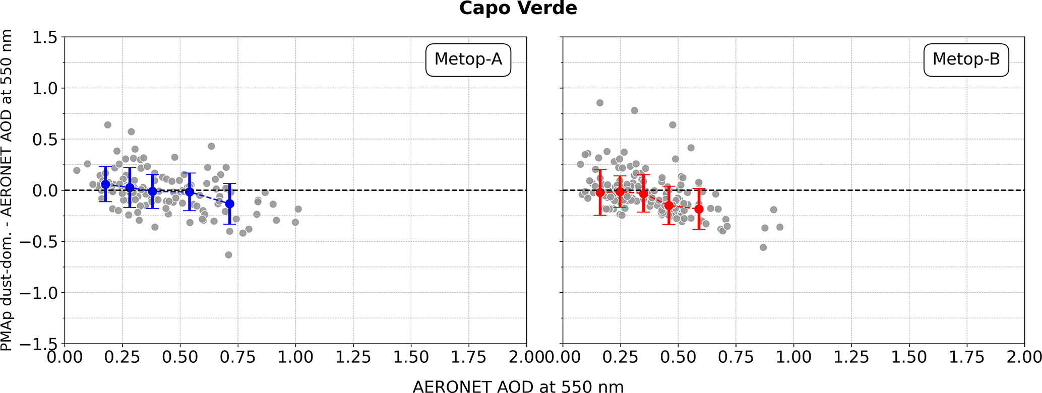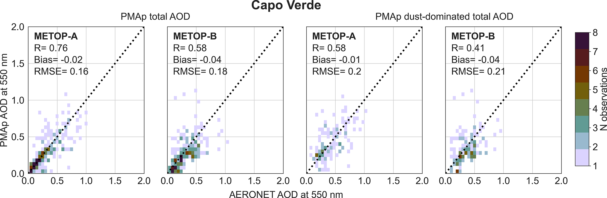 Unlike other stations, all PMAp observations at Capo Verde are categorized as retrievals over water, which differs from the retrieval method over land. For ocean retrievals, if dust is detected, PMAp employs three distinct dust aerosol models (compared to a single model over land) to achieve the best fit. In addition, for dust-classified pixels GOME-2 reflectances are not corrected for clouds but it is assumed that the scene contains only aerosols. When compared with AERONET data, PMAp data (both total and dust-dominated total AODs) show relatively low mean biases and RMSEs for both satellites (Fig. 13). Adding the dust filter to the AERONET data improves the correlations and RMSEs. However, for Metop-B the mean bias increases in absolute values from −0.04 to −0.11 (Appendix B, Fig. B9).
