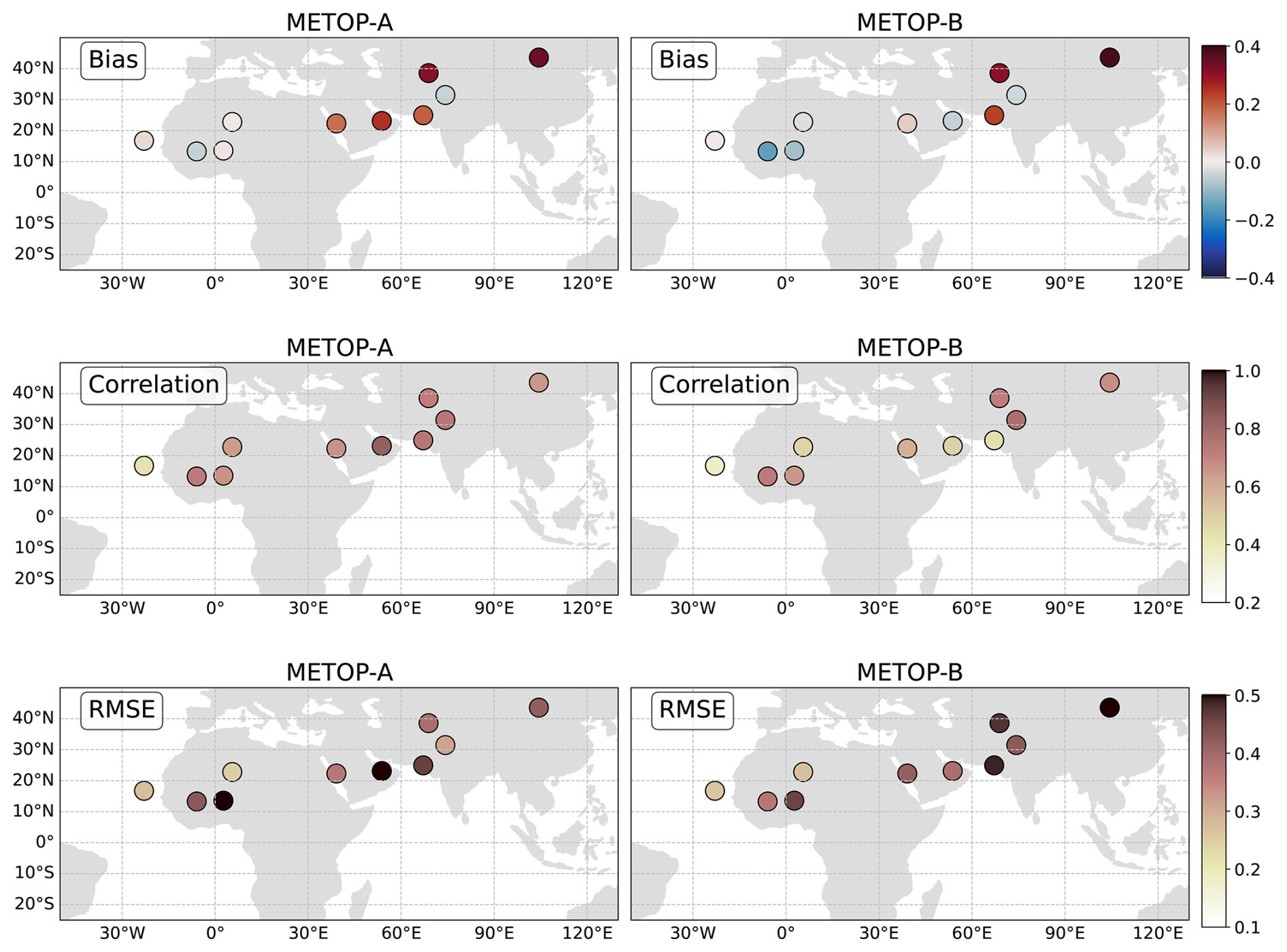 The region consists of two AERONET stations located in major cities, Lahore and Karachi, where anthropogenic emissions play a significant role on the aerosol environment. Correlations with AERONET for both Metop-A and Metop-B, for total or dust-dominated total AODs are fairly similar, ranging from 0.6 to 0.8, except in Karachi, where Metop-B displays somewhat lower correlations for dust-dominated total AOD (Fig. 9). The dust-dominated total AOD RMSEs are notably high, exceeding 50 % of the mean AERONET AOD. Including a dust filter for the AERONET data appears to slightly improve the comparisons, particularly by reducing RMSEs, despite a decrease in the number of collocated observations. An exception is observed for Metop-B in Karachi, where RMSEs remain elevated at approximately 80 % of the mean dust-filtered AERONET AOD (Appendix B, Fig. B5). In other cases, RMSEs are generally reduced to 50 % or less of the mean dust-filtered AERONET AOD, indicating a lower relative error.