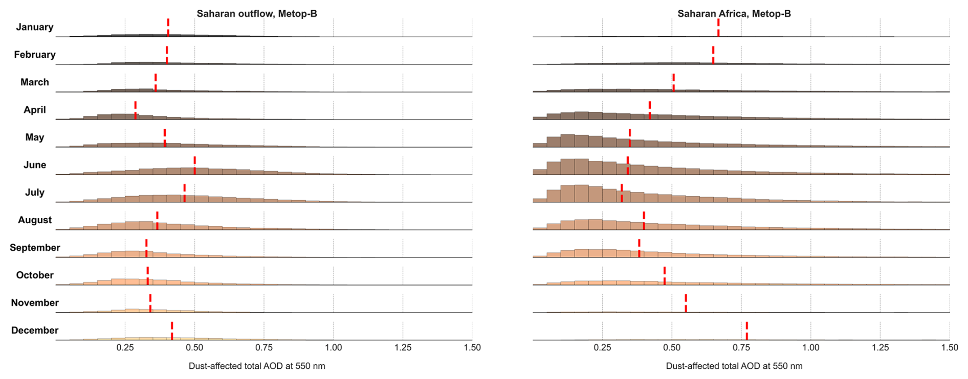 When analysing closer the seasonal variation of dust-related AOD in specific study areas, the overall availability of observations needs to be considered. An example of this is illustrated in Fig. 17, where monthly distributions for dust-related AODs are shown, defined from the whole Metop-B CDR. In the Saharan outflow area, it is seen how there is a clear increase in overall dust-related AOD observations during June and July, while the distribution also shifts towards larger values increasing the seasonal dust-related AOD median. In the Saharan overflow area, there is also a continuous dust-related AOD distribution present during the NH winter months, even though the number of observations is significantly lower.