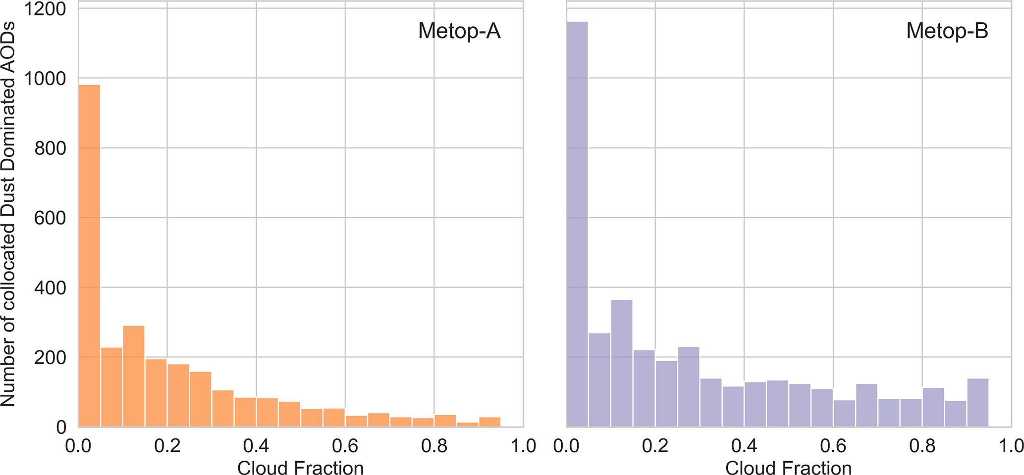 Before conducting the analysis, both CDRs were examined for potential cloud contamination effects. A cloud correction (decontamination) scheme, implemented in the PMAp retrieval algorithm (Grzegorski et al., 2022), minimizes the impact of residual clouds on aerosol property retrieval in partially cloudy scenes. However, this cloud correction factor is not fully applied to scenes flagged as dust. As a result, fractional cloud cover may still be present in PMAp dust scenes, even when the data is collocated with strictly cloud-free AERONET observations. Figure A1 presents the distribution of PMAp cloud fractions for Metop-A and Metop-B dust-dominated AODs collocated with AERONET data, combining all AERONET stations. While most observations occur under cloud-free conditions, there are instances where fractional cloud cover is present.
