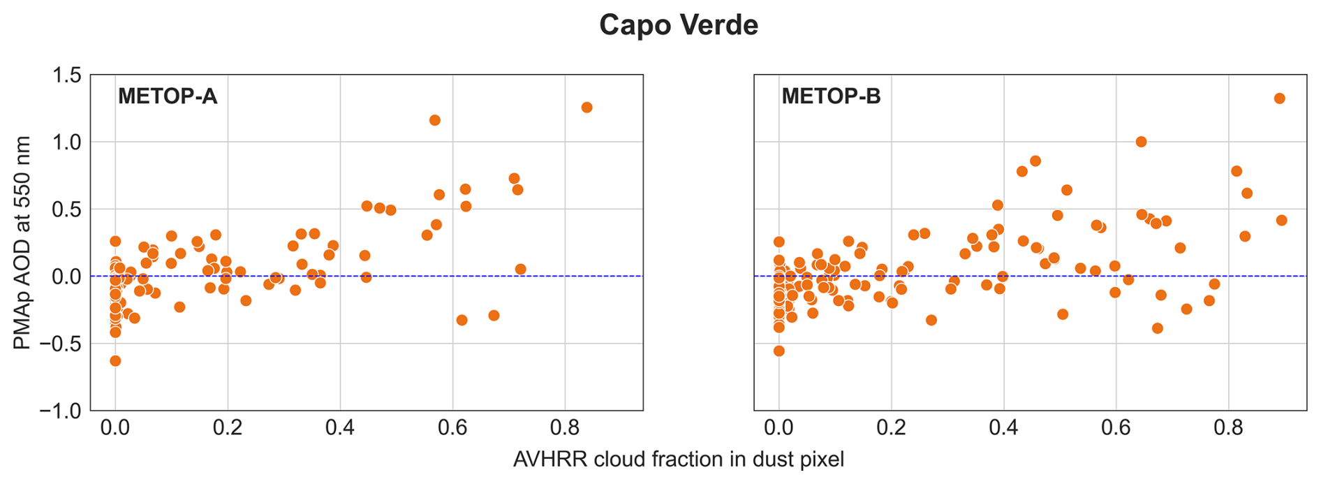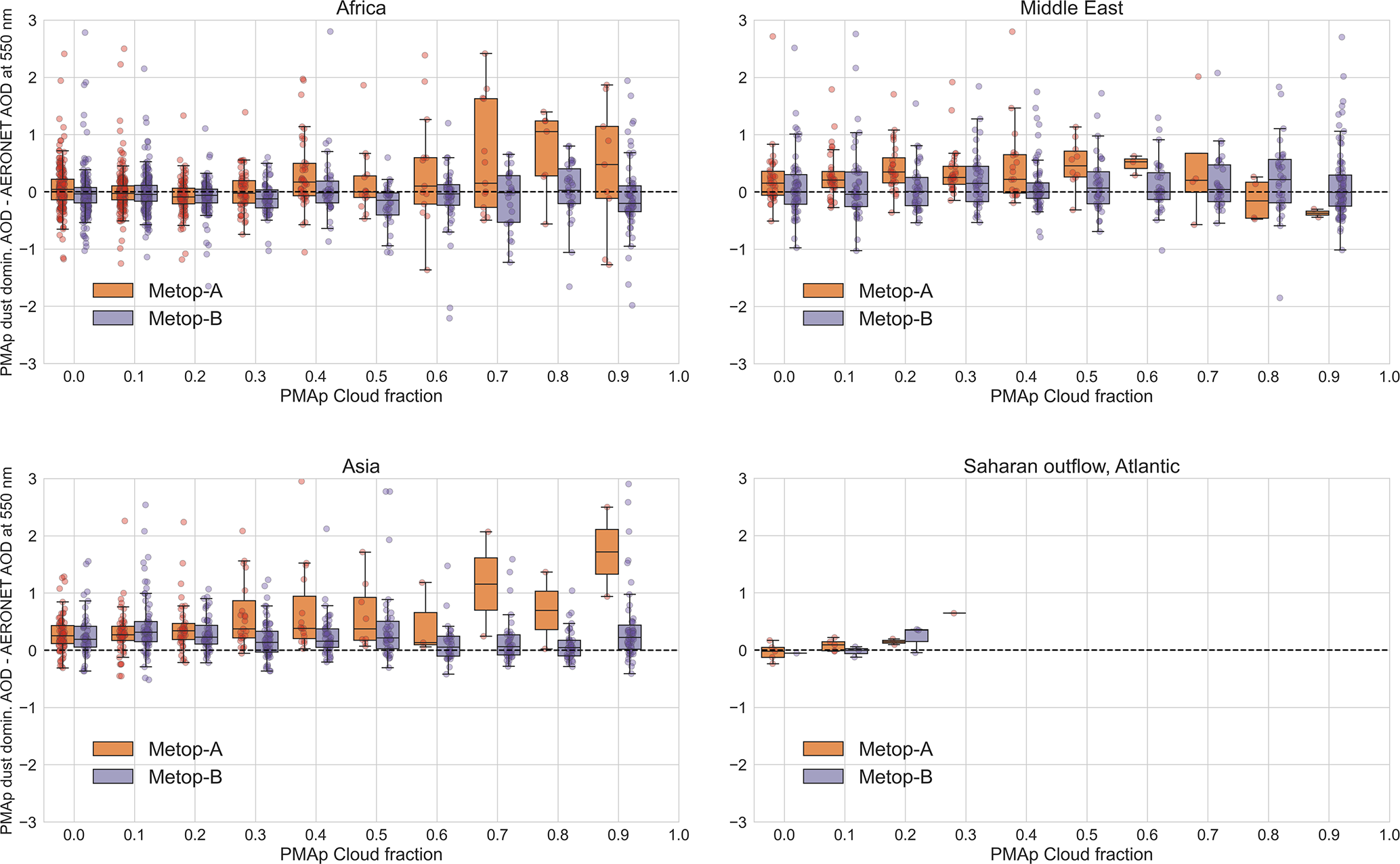For dust scenes over ocean an additional cloud filter was applied, based on the AVHRR cloud fraction. Based on the tests carried out at Capo Verde station, the threshold was set to 0.6. Figure A3 shows the PMAp dust-dominated AOD bias as a function of AVHRR cloud fraction.