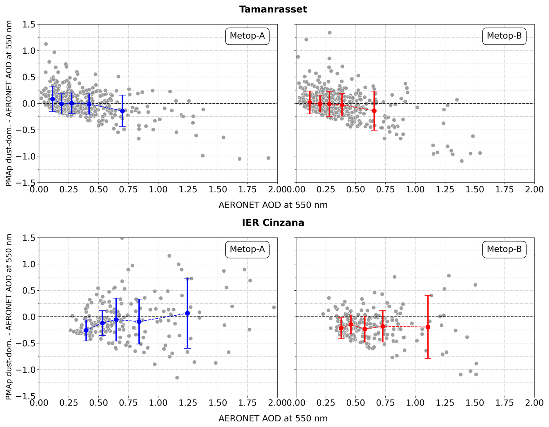 Two methods were employed to validate PMAp total and dust-dominated AODs against AERONET observations. The first approach involved a general validation of both total and dust-dominated AODs without filtering the AERONET data specifically for dust cases. This includes also a comparison of PMAp total AOD to assess whether significant differences emerge between the total PMAp AOD and those pixels that are specifically retrieved using the PMAp dust scheme. The analysis was carried out separately for Metop-A and -B at each AERONET station. The second approach narrow the validation to dust-specific cases only, by comparing PMAp dust-dominated total AODs with AERONET data filtered for dust (using criteria of α440–870 nm < 0.75 and dSSA < 0).